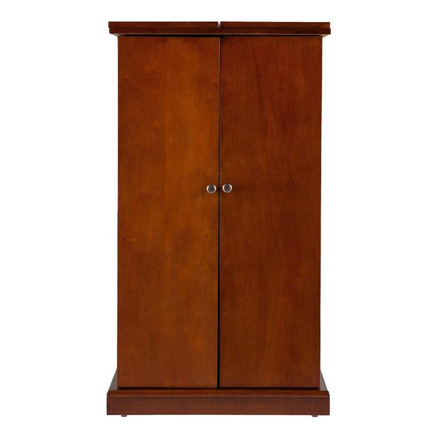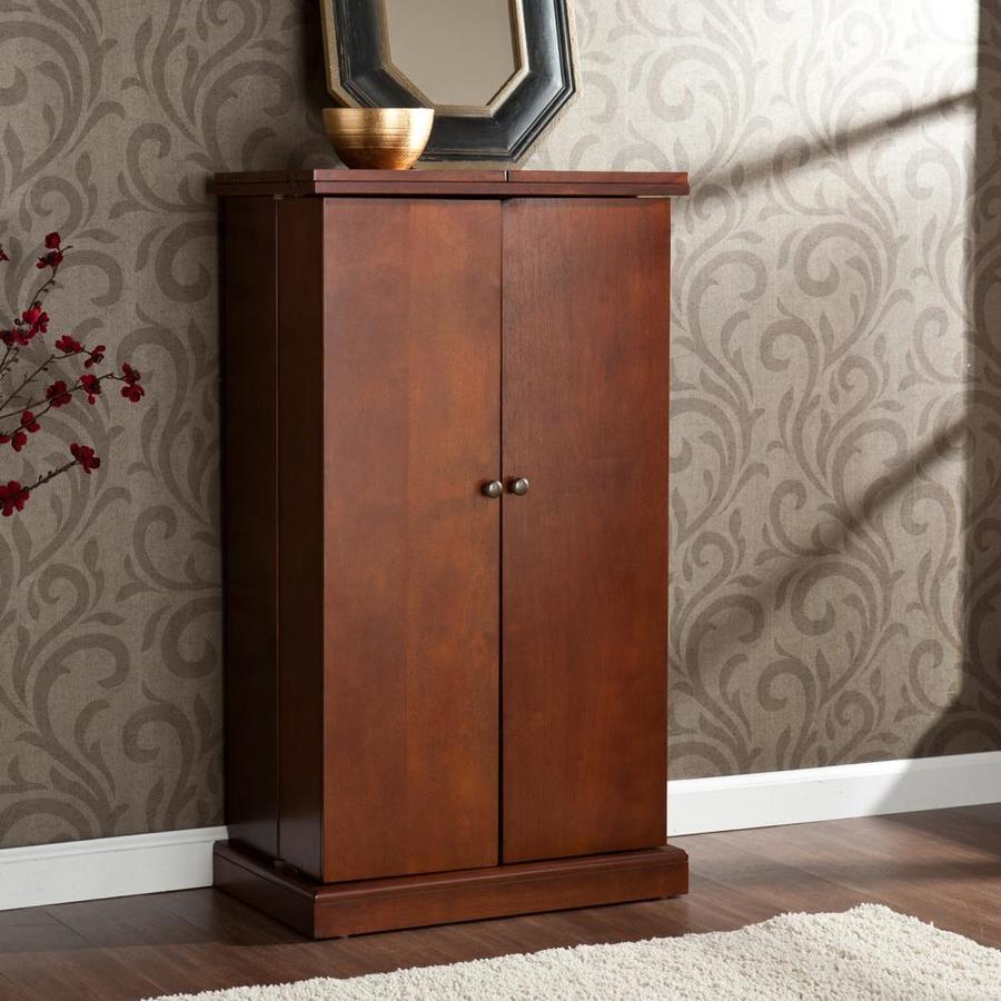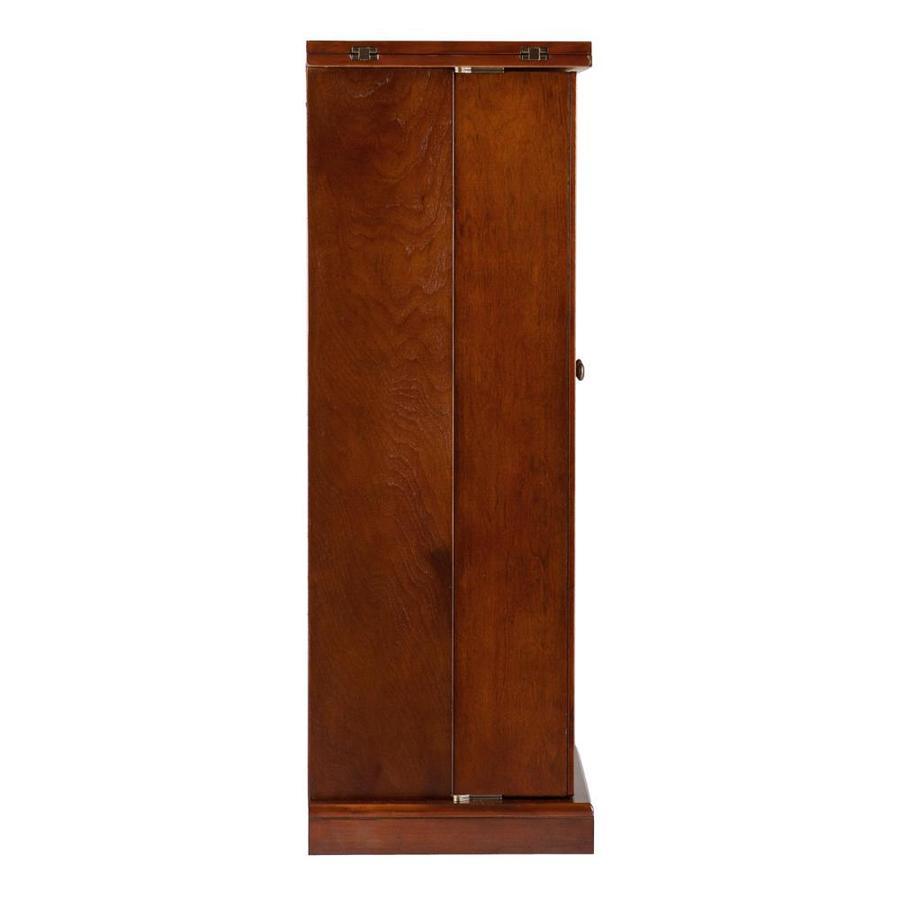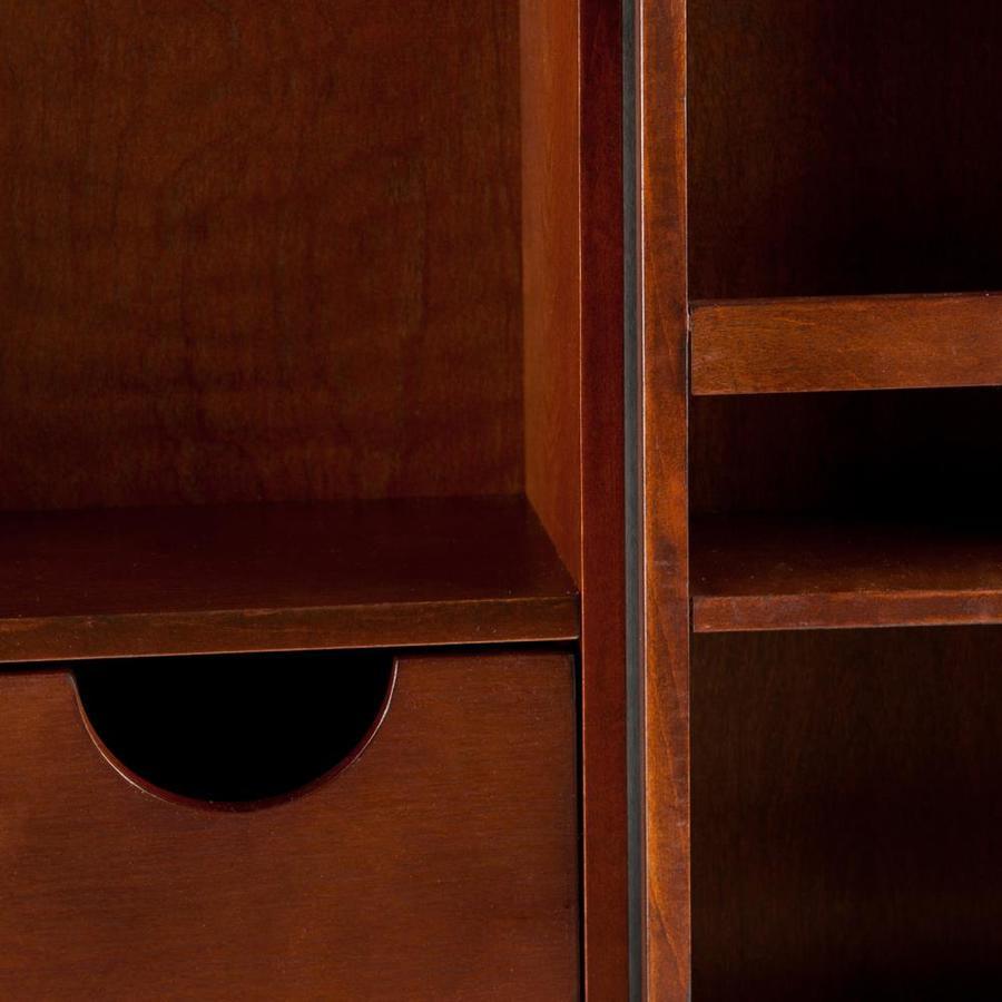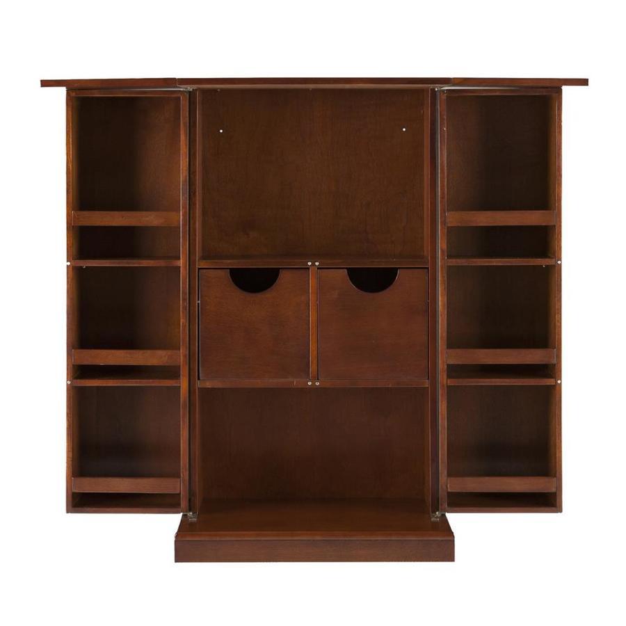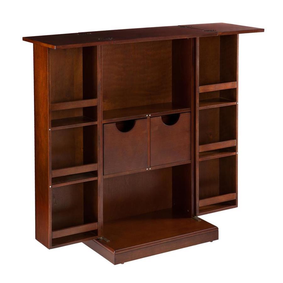 With fold-out features, this bar provides ample storage space for your favorite bottles and specialty glasses Fold-away bar has 8 shelves for displaying bottles and glassware, in addition to 2 drawers for less decorative items Unique fold away system also features railings on the shelves to hold your prized possessions in place Unit measures 44-in wide when open, 22-in wide when closed Drawers each measure 9.5-in W x 6.5-in D x 9.25-in H Storage shelves in door each measure 9.25-in W x 5.75-in D Middle cabinet shelves measures 19.5-in W x 7-in D Constructed of hardwood, MDF, and wood veneer