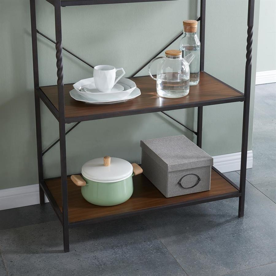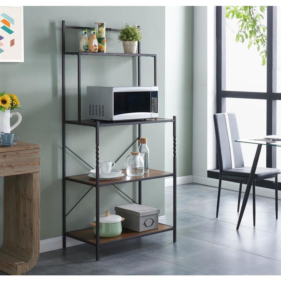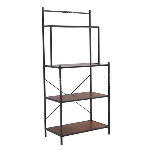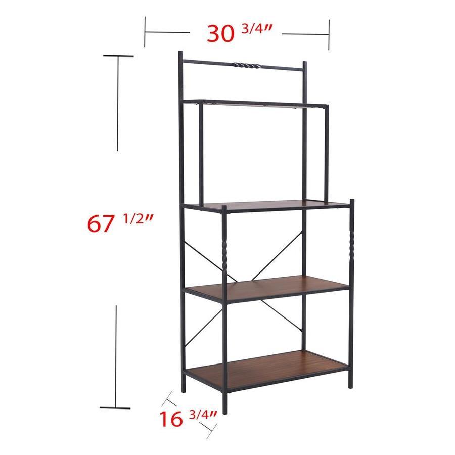 With rustic metalwork and dark pine shelves, this kitchen storage tower adds a touch of industrial style to your home Spacious shelves are microwave, toaster oven, and coffee maker compatible 3 shelves and 1 microwave-ready countertop Countertop: 30.75-in width x 16.75-in depth x 38-in height/0.5-in thick Footprint: 30.75-in width x 16.75-in depth Supports up to: 30-lbs on each shelf and countertop