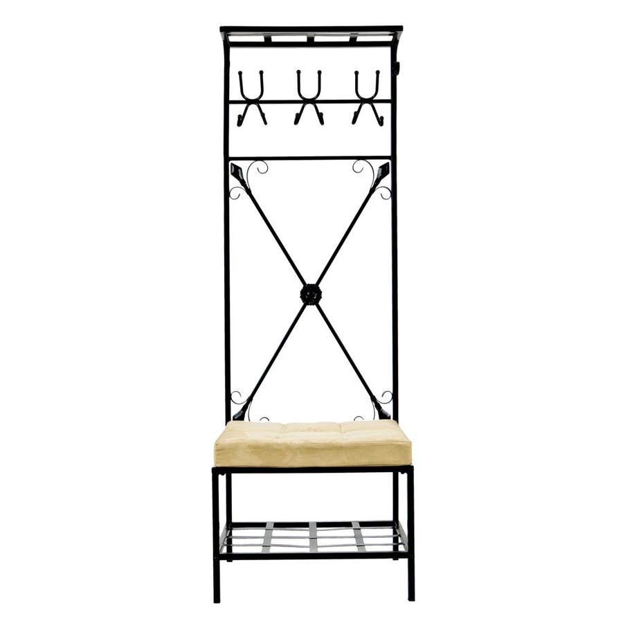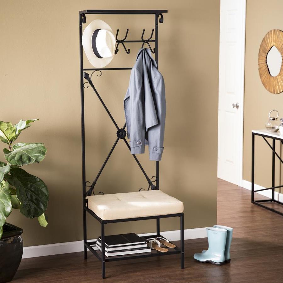 Gives you a place to hang umbrellas, coats, and bags Convenience of being able to sit down to take your shoes on and off The lower shelf is raised 6-in off the ground to give you shoe storage without cluttering the floor Upper shelf extrudes 8-in from the wall to top the whole thing off, perfect for hats and knick knacks Frame is constructed of metal for strength with a 3-in foam pillow seat covered in fabric