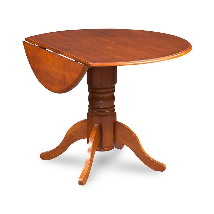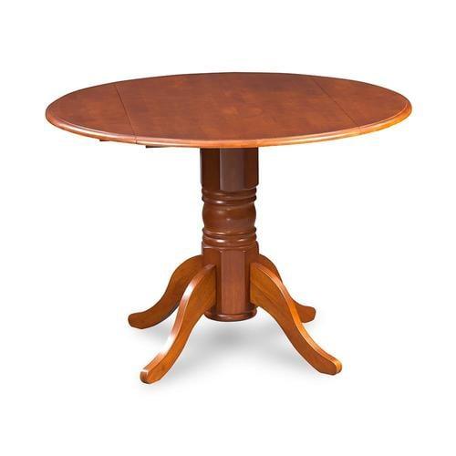The 42-in Burlington dining table features a round solid wood top with an elegantly carved pedestal base that can comfortably seat up to 4 people Table top has (2) 9-in drop leaves that is perfect to save space for small dining room or eat-in kitchen It is sturdy and with the convenient adjustable levelers the table is stable on any uneven floor surfaces The table top is finished with a special coating that prevents permanent mark on tabletop from hot or cold object Features (2) 9-in drop leaves; each is reinforced by 3 double hinges Table base is a pedestal with elegantly carved legs 100% solid rubber wood; no MDF, veneer or pressured wood used Simple assembly required