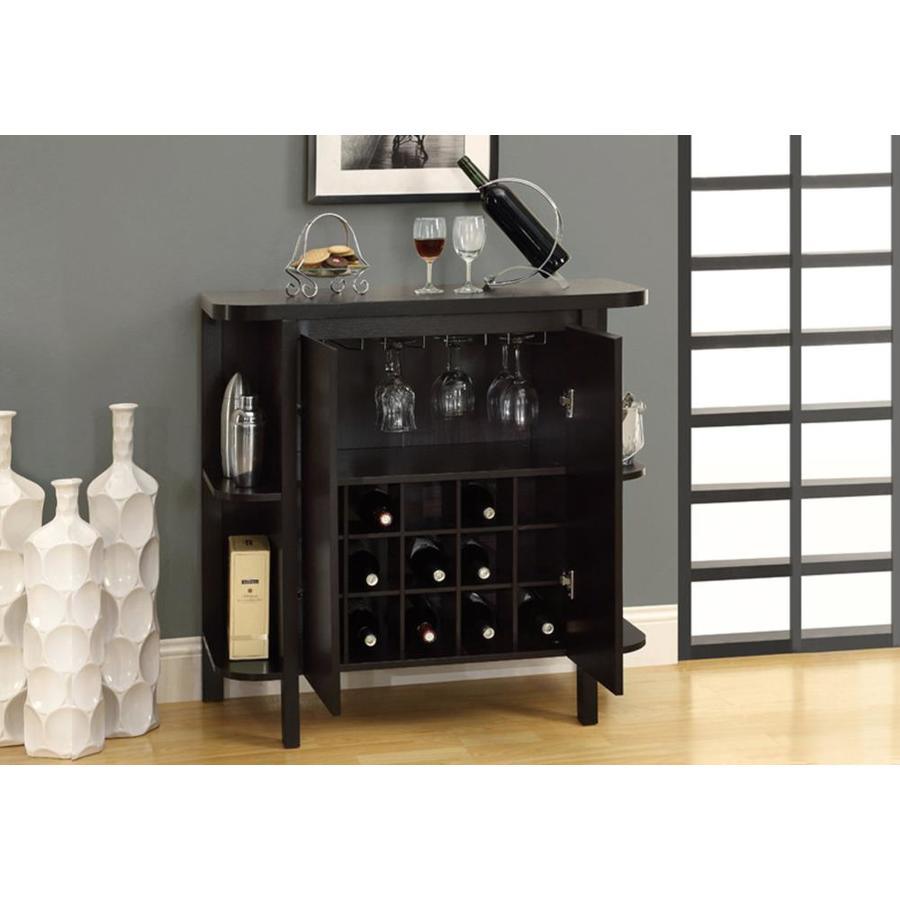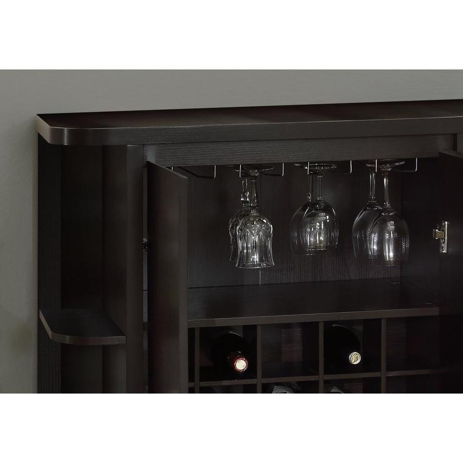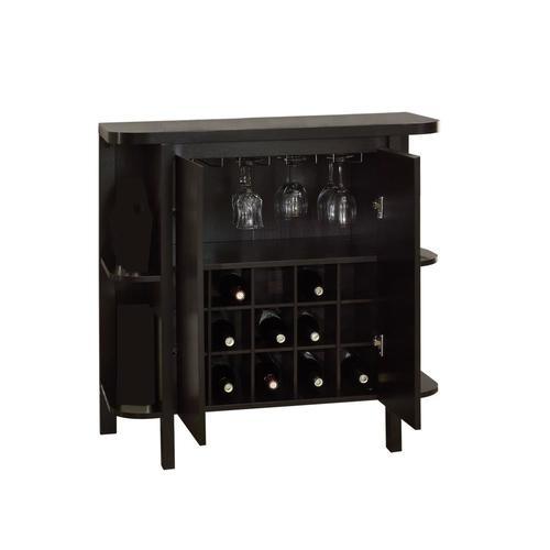 2 Door cabinet style closed storage Suspended stem glass holder with fixed shelf Wine storage for up to 15 bottles (removable wine rack) 2 Open shelves on each side Holds up to 8 small wine glasses Assembly required Bottle storage holds up to 15 bottles (removable wine rack): 23-in W x 15-in D x 14-in H Top: 15-in W x 5-in D x 14.25-in H Bottom: 15-in W x 5-in D x 14-in H