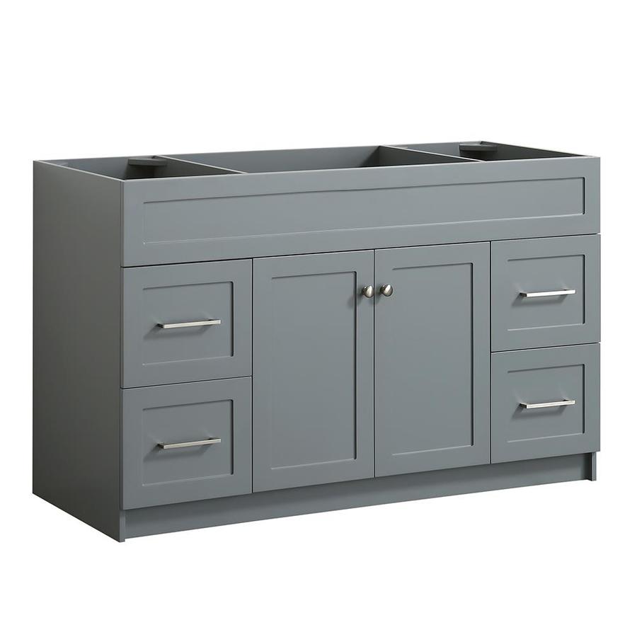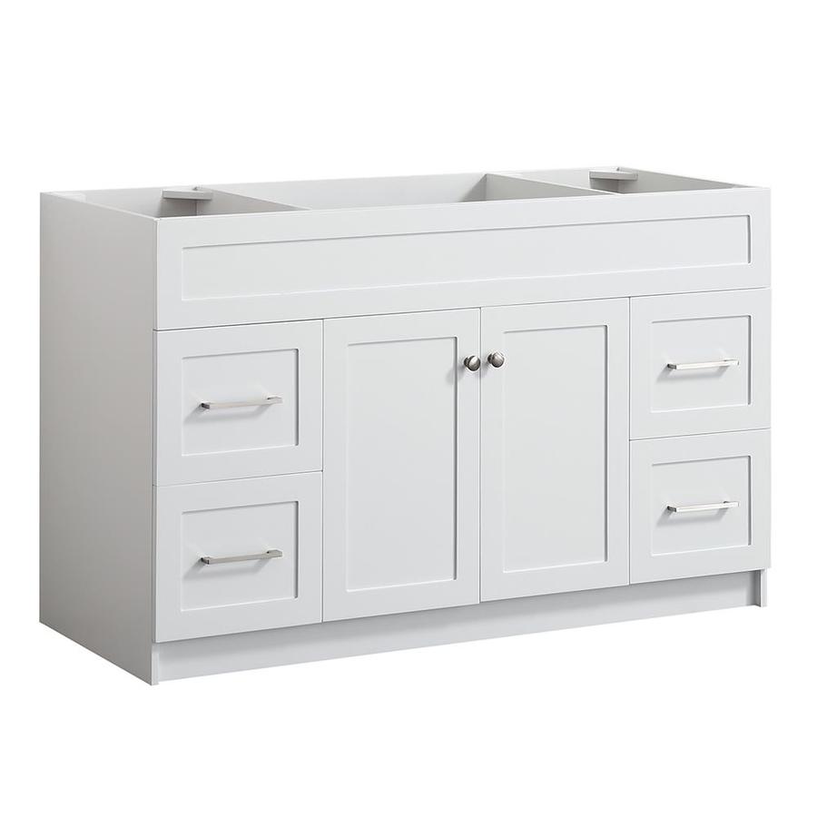54-in W x 21.5-in D x 33.5-in H Hardwood plywood construction for lasting beauty and durability Black painted finish Two soft-closing doors with adjustable hinges so you'll never have to worry about hearing a door slam Dovetail construction drawer boxes for additional strength and durability Four full extension, self-closing drawers to meet all your storage needs Built in toe kick so you don't have to worry about cleaning under the cabinet Satin nickel finish hardware included Open back for easier installation