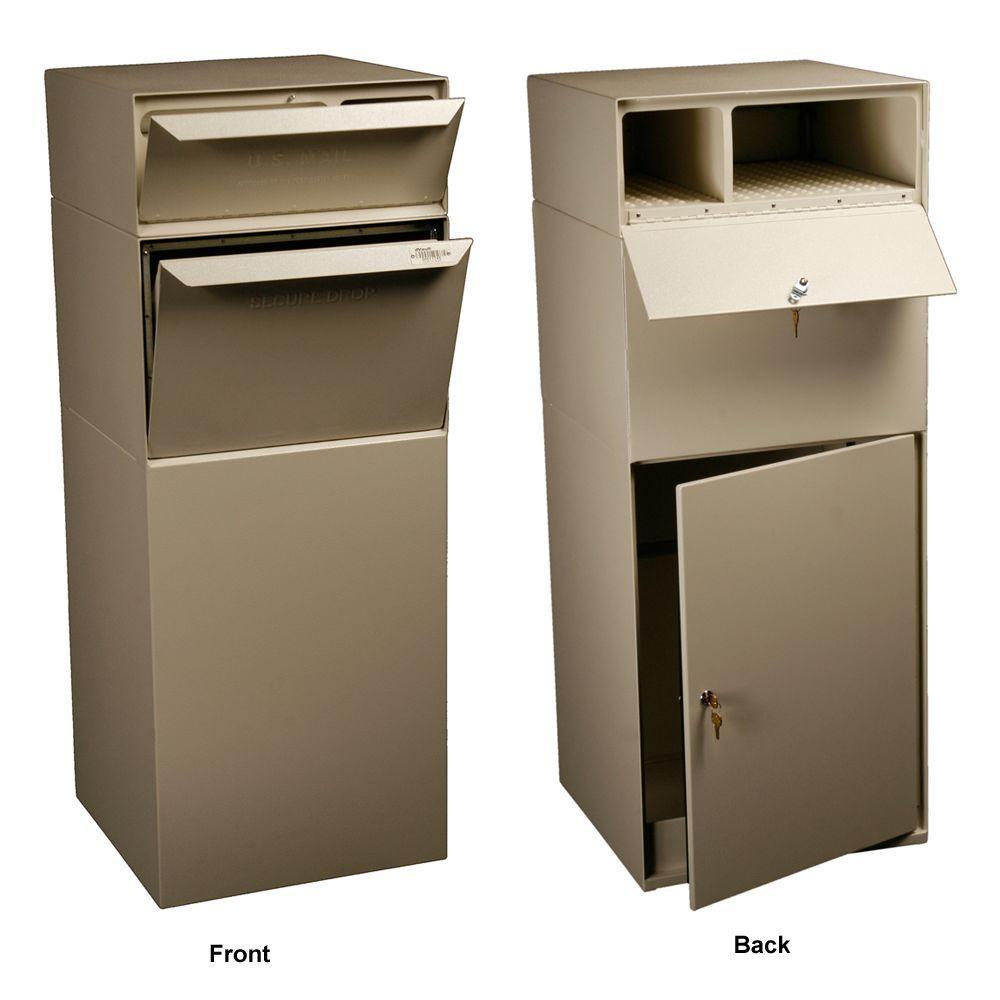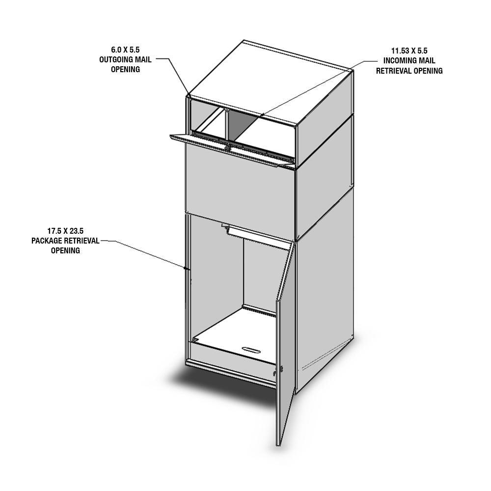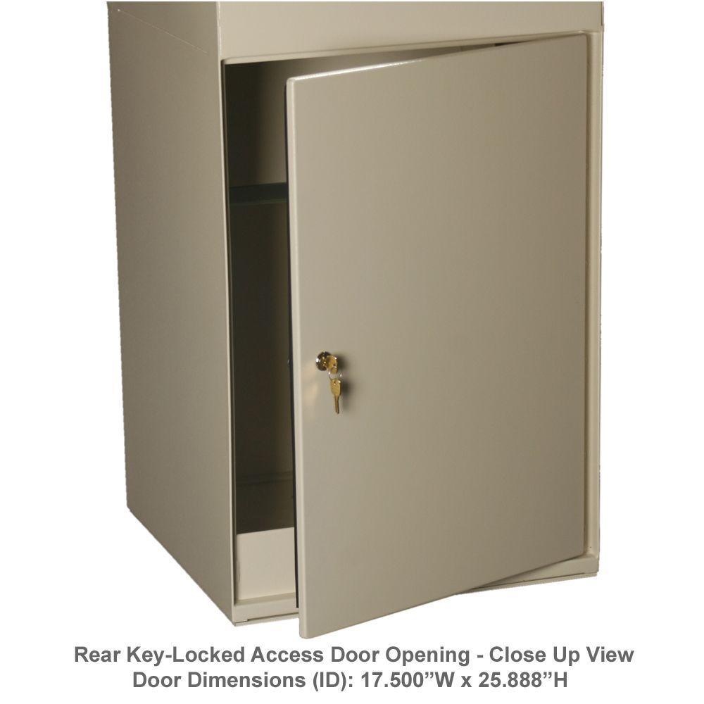 Never worry about package theft again with the Curbside Mail and Package Delivery Vault. This USPS Approved Delivery Vault comes equipped With a Full Service Locking Letterbox, a unique security drop door mechanism (U.S. Patent Number 6,347,737) and a rear key locked storage compartment that prevents access to deposited packages. Constructed from heavy duty 16-Gauge galvanized steel with a durable powder coated polyhammer black finish and stainless steel hinges, the Delivery Vault withstands the elements and tampering. The Delivery Vault can be enhanced during installation with decorative options to blend into architectural and landscaping themes. Electrical knockouts for underground feeds are included.