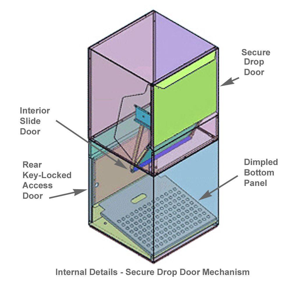 • Unique security-drop door mechanism and rear anti pry post-locked storage compartment prevent access to deposited packages (U.S. patent number 6,347,737)