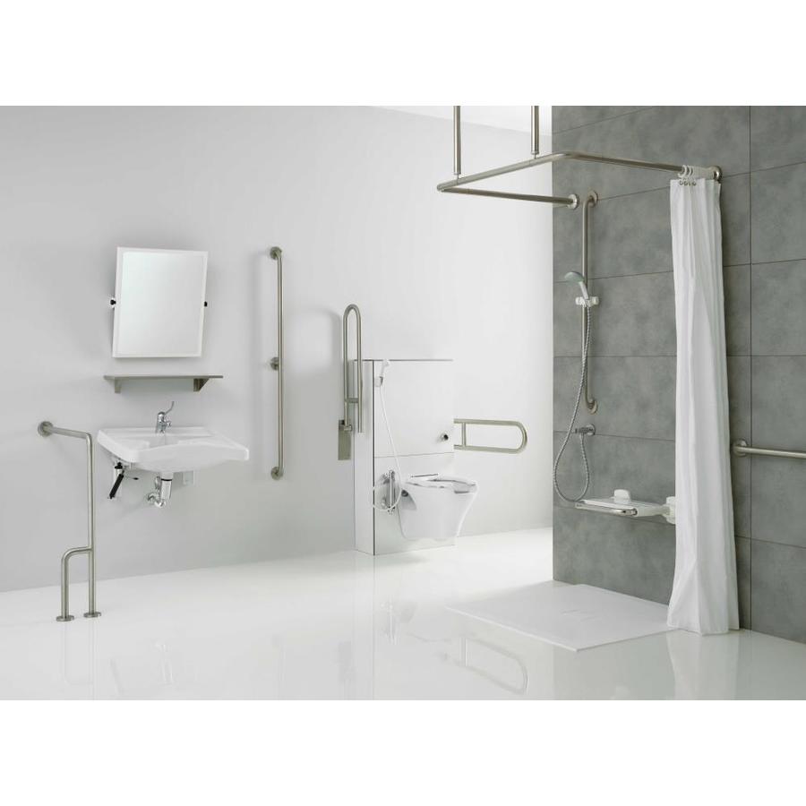 This support grab bar attaches from floor to wall with reinforcement Features satin-finish stainless steel construction Bar mounts to the floor and wall at 90° angle Bar measures 30-in and 34.5-in at sides Composed of recycled materials and is recyclable Made in Italy Easy to clean