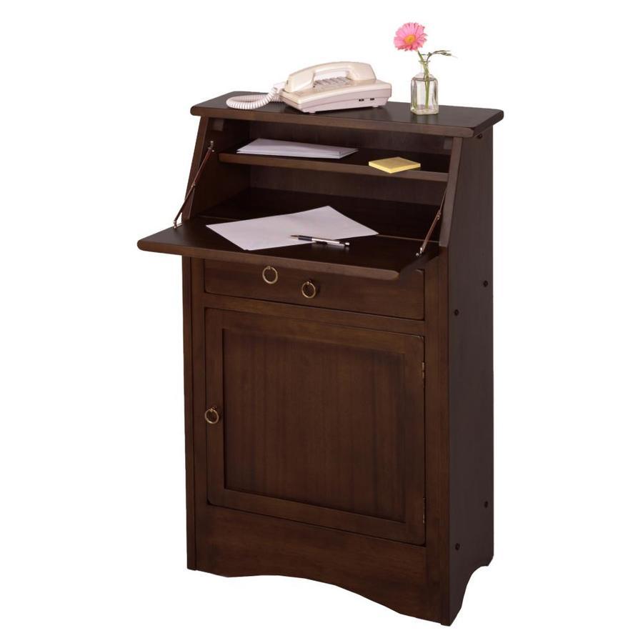 Classic style secretary desk Drop down cabinet creates a flat writing surface and provides ample space for supplies A drawer and large cabinet offer plenty of additional storage space When it folds up, the sleek walnut-finished desk remains an elegant piece of furniture Walnut finish Assembly is required