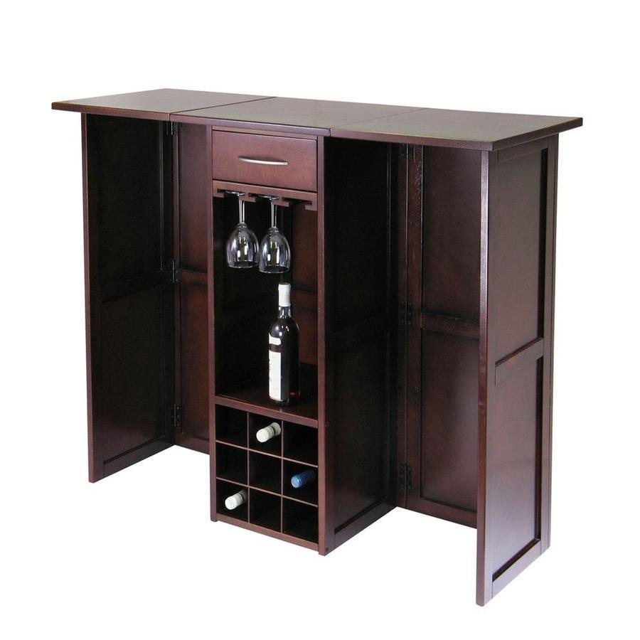 Wine bar with expandable counter Compact wine unit when closed, open and expand to a bar counter for serving, ample space to hide your bottles behind the counter Closed dimensions: 17.50in W Made of solid wood in walnut stain Assembly is required