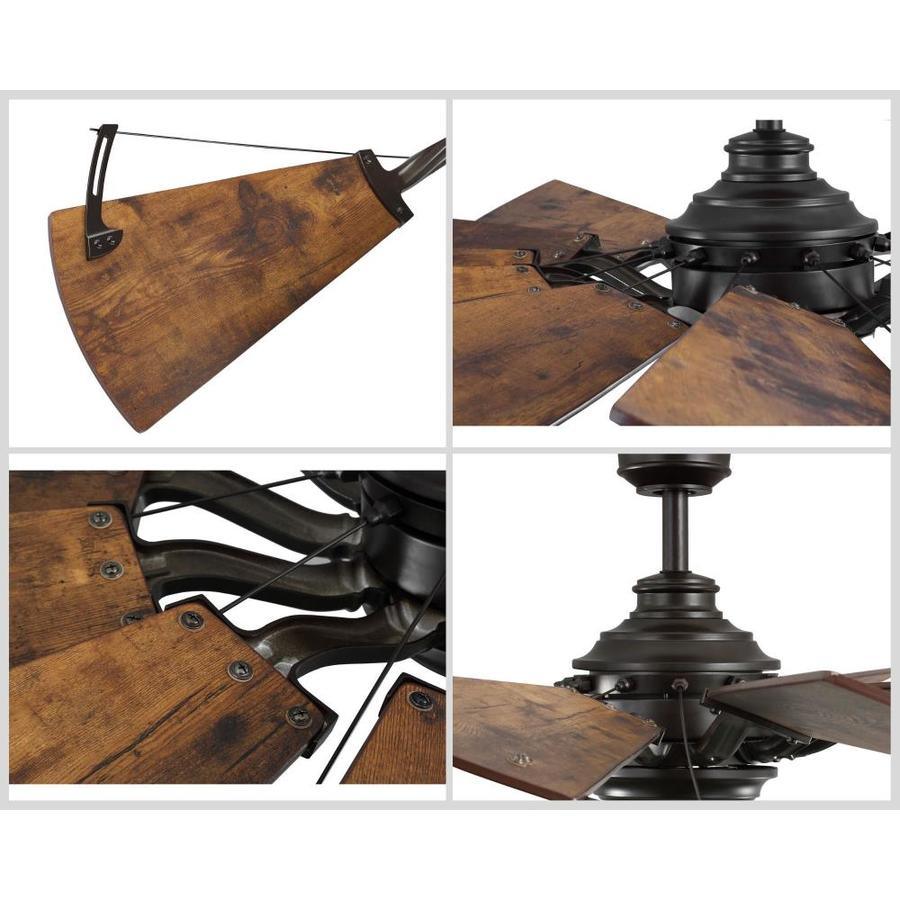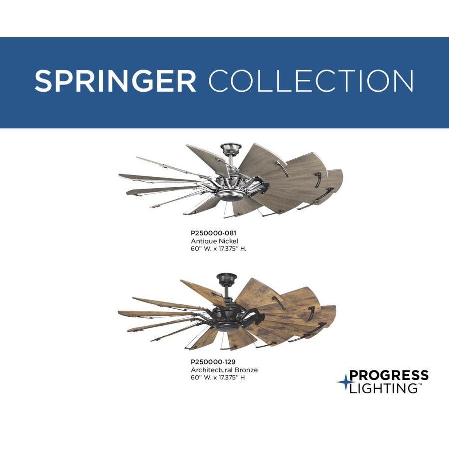 Relax under the refreshing breeze of the Springer Collection 60-Inch 12-Blade Distressed Walnut Coastal Windmill Ceiling Fan ideal for any great room, bedroom, living room, or bonus room Perfect for coastal, farmhouse, rustic, and industrial settings Ceiling fan has 12 steel blades and stretches to a full 60-inch diameter The 12 blades are coated in a distressed walnut finish accented by an architectural bronze center canopy for a charming rustic character 6-speed remote control is included so you never have to break a sweat while customizing your cooling breeze Not light kit adaptable UL dry location listed A 1-inch by 8-inch down rod is included to provide you with the design flexibility to meet your unique home decor vision Pairs with Progress fixtures from the Gulliver Collection and Briarwood Collection