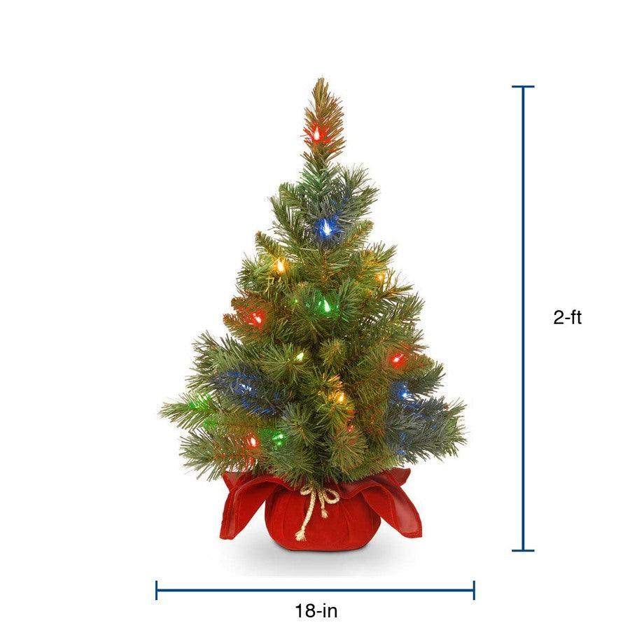 This tabletop tree will add a colorful accent to your holiday decorating scheme Seated in a gold rope tied red cloth bag, this majestic fir is compact and easy to find a place for display It is pre-strung with 35 battery-operated multicolor low-voltage LED lights that are energy-efficient, long lasting and cool to the touch Timed operation: 6 hours on, 18 hours off 35 multi colored battery operated LED lights Number of tips: 71 Flame-resistant materials Hook-in, hinged and wrapped construction