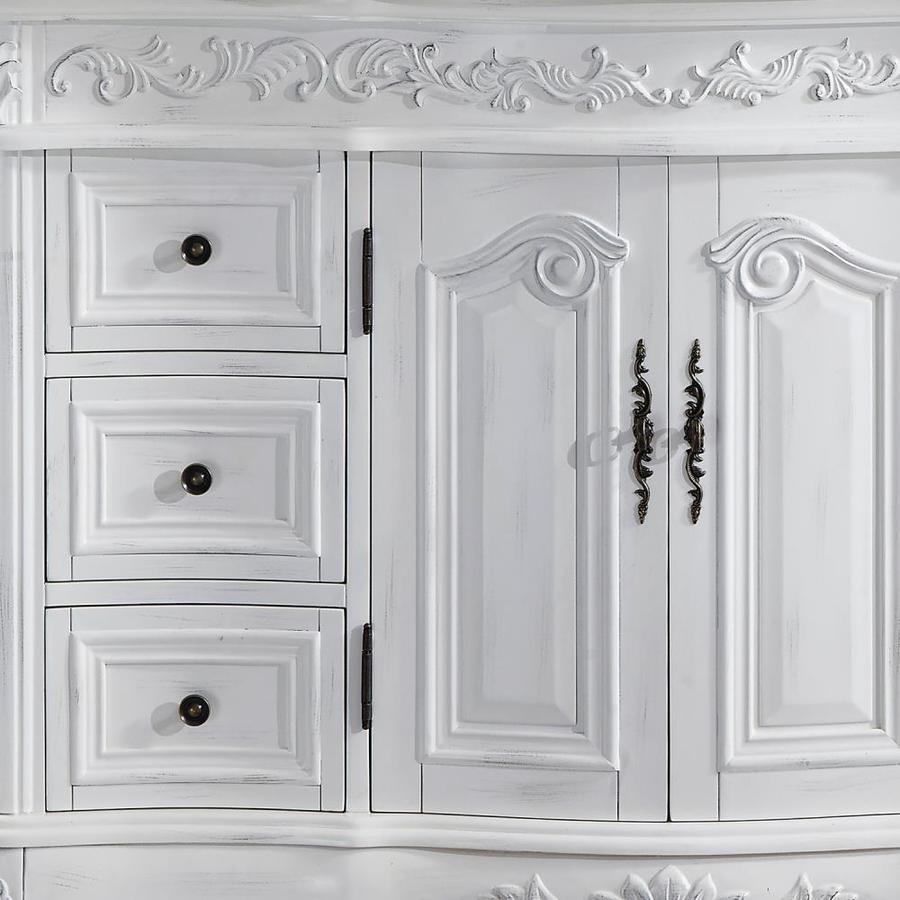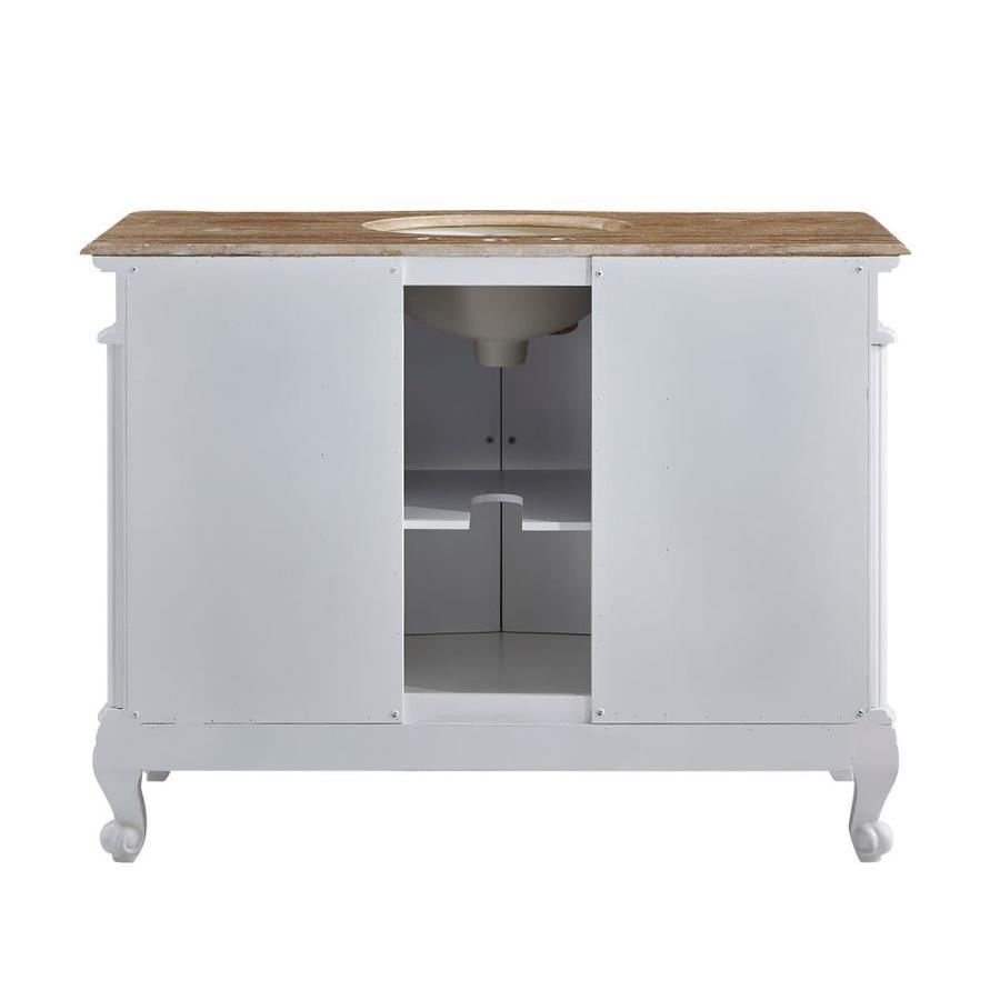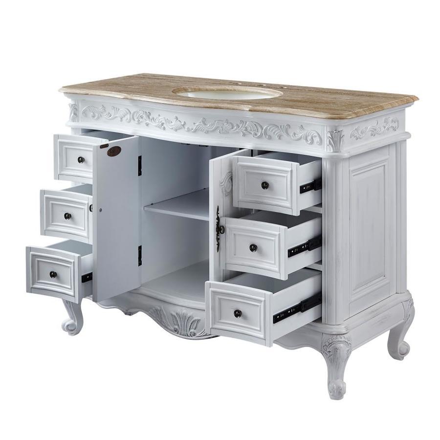 Overall dimensions (inch): 48w x 22d x 36h Traditional bathroom single sink vanity cabinet Comes with travertine stone countertop Comes with ivory ceramic undermount sink Natural stone, solid wood structure and TSCA title VI certified panels Pre-drilled for 8-in widespread faucet Drain and faucet are not included Cabinet comes with distressed finish