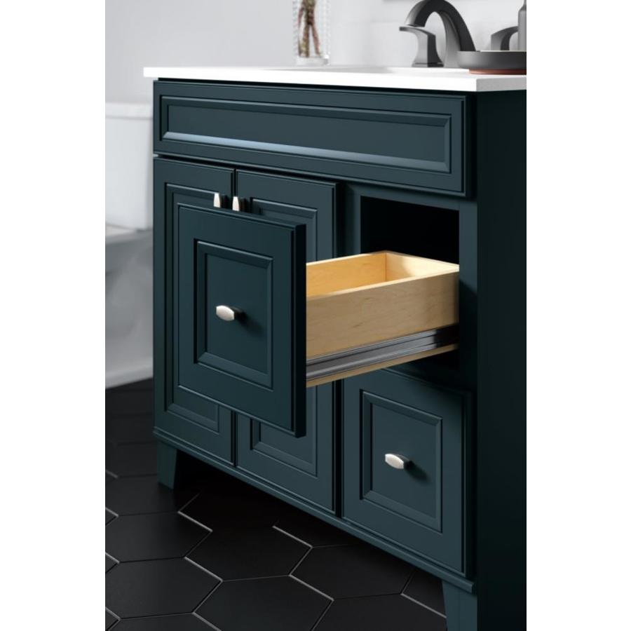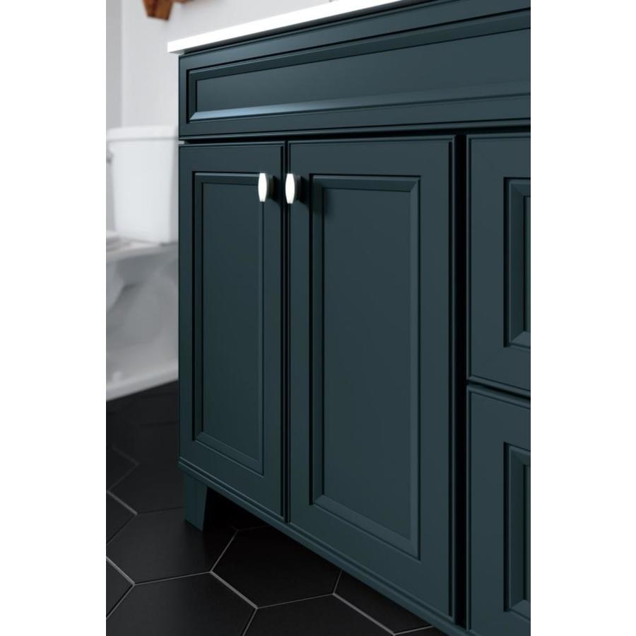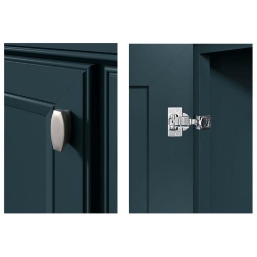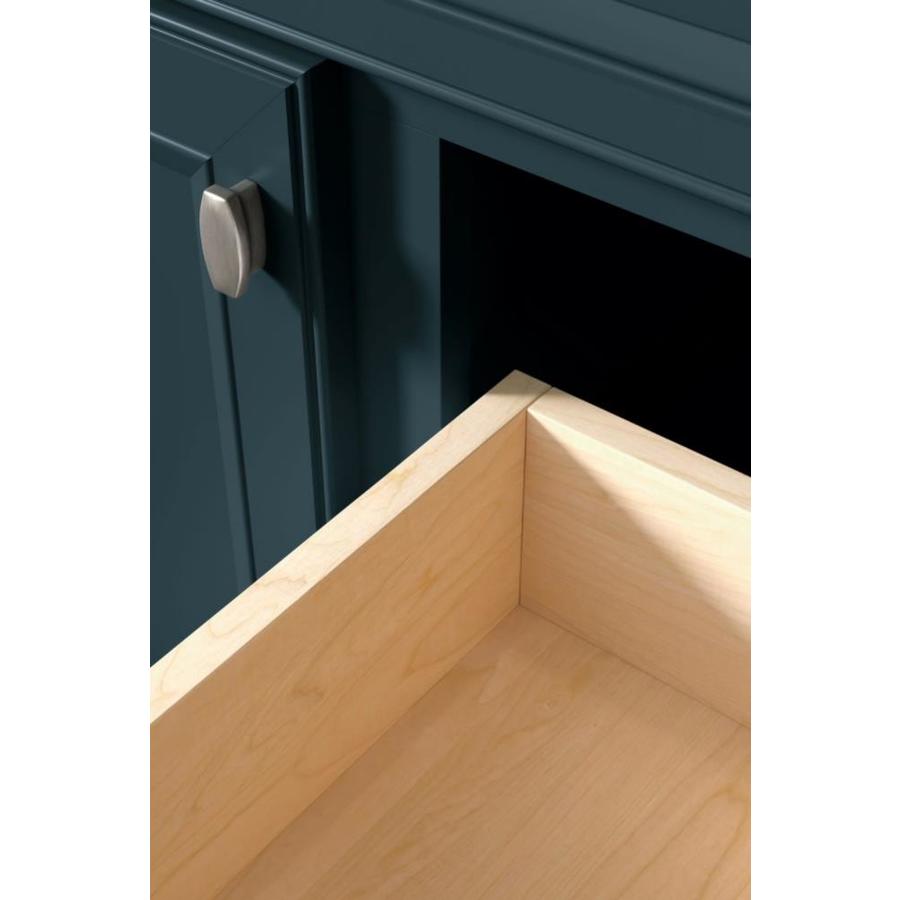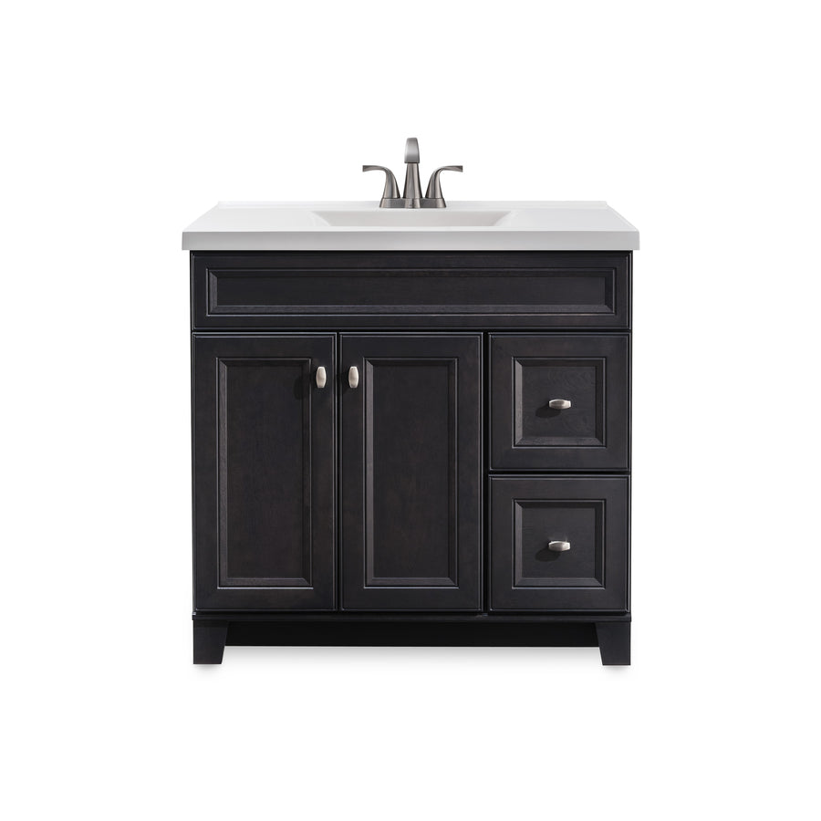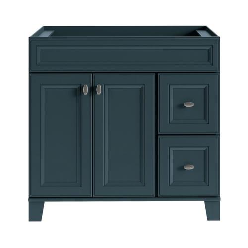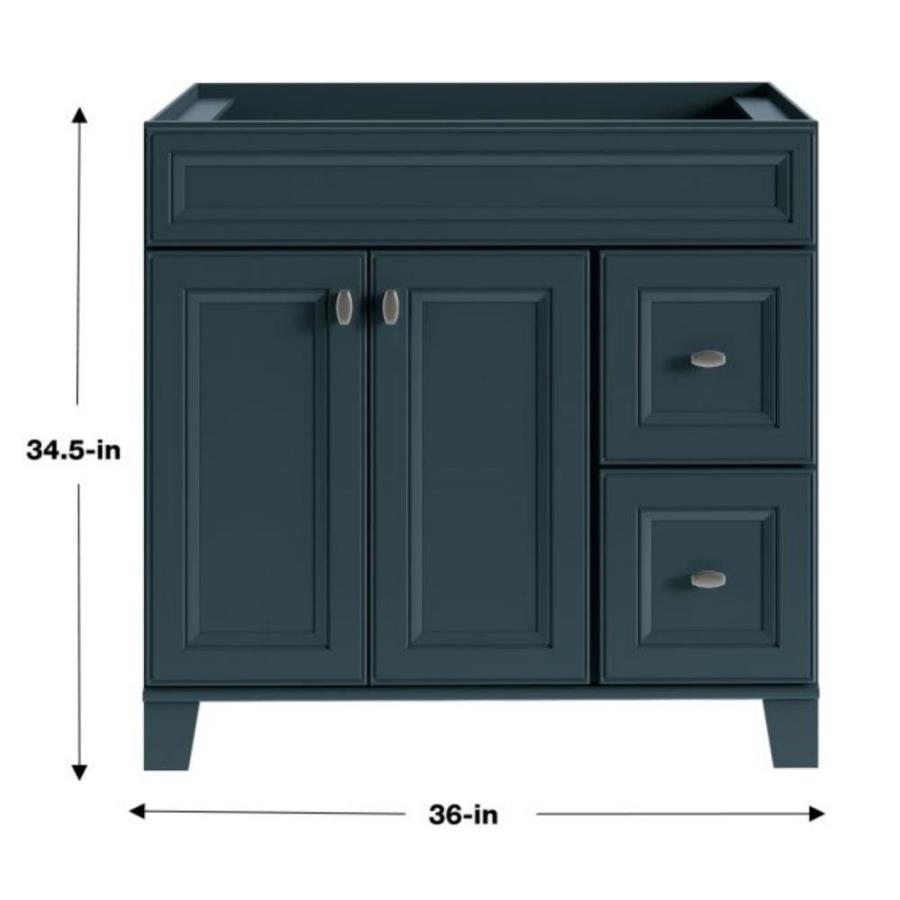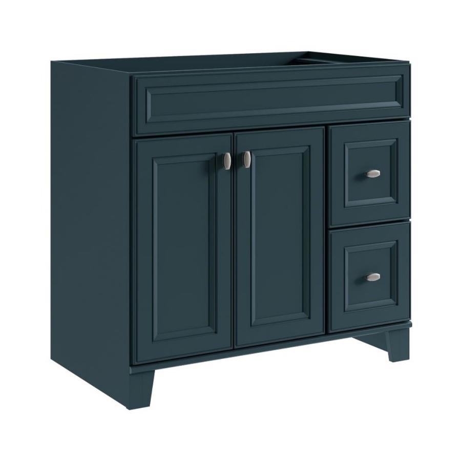 Maritime finish vanity from the Goslin collection blends well with most bath decor 37-In W x 22-in D x 38.75-in H vanity, perfectly sized for any bathroom Features 2 full-extension drawers and 2 cabinet doors Compatible with 37-in W x 22-in D vanity tops (sold separately) Brushed-nickel finish hardware adds a touch of shine Fully assembled and ready to be installed Ideal for the transitional home, blending with everything from traditional to modern styling