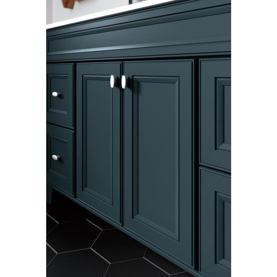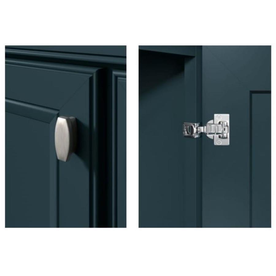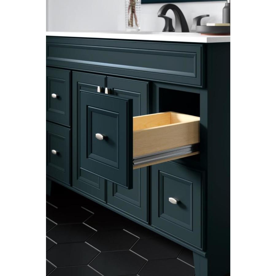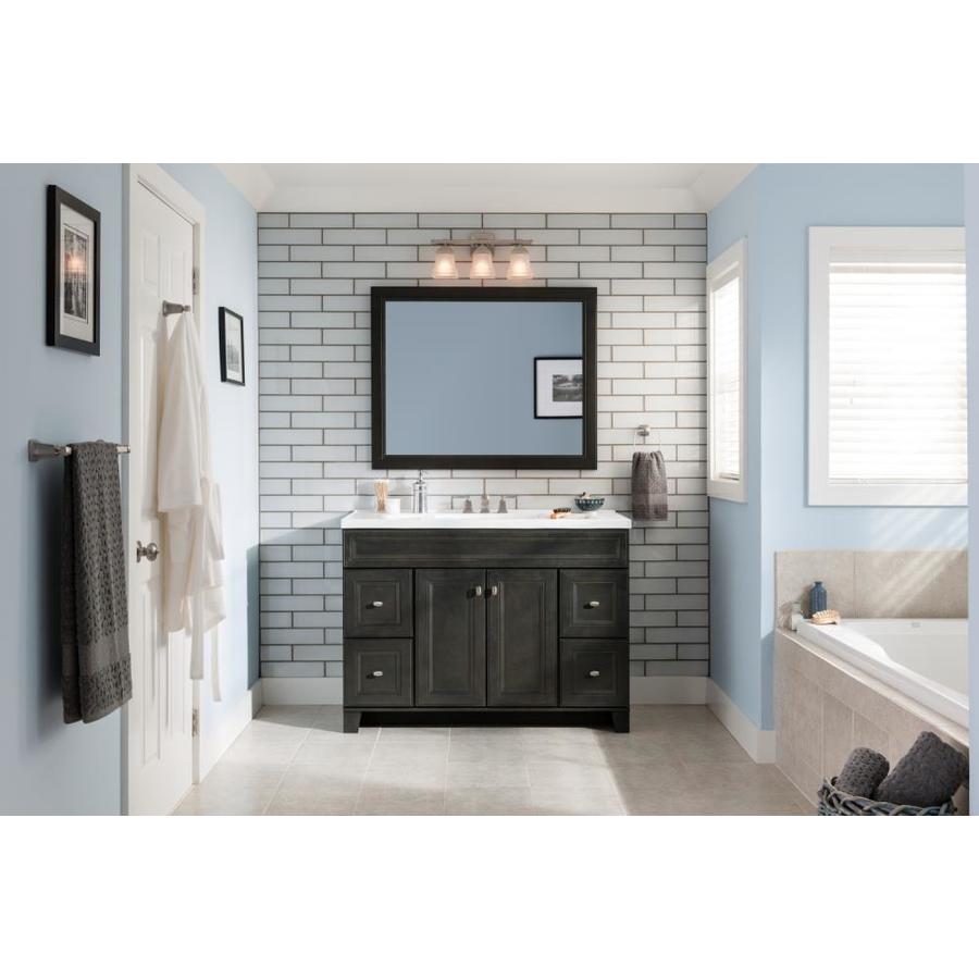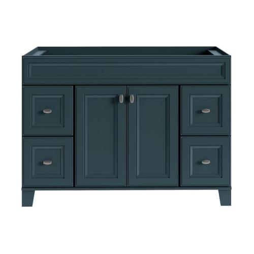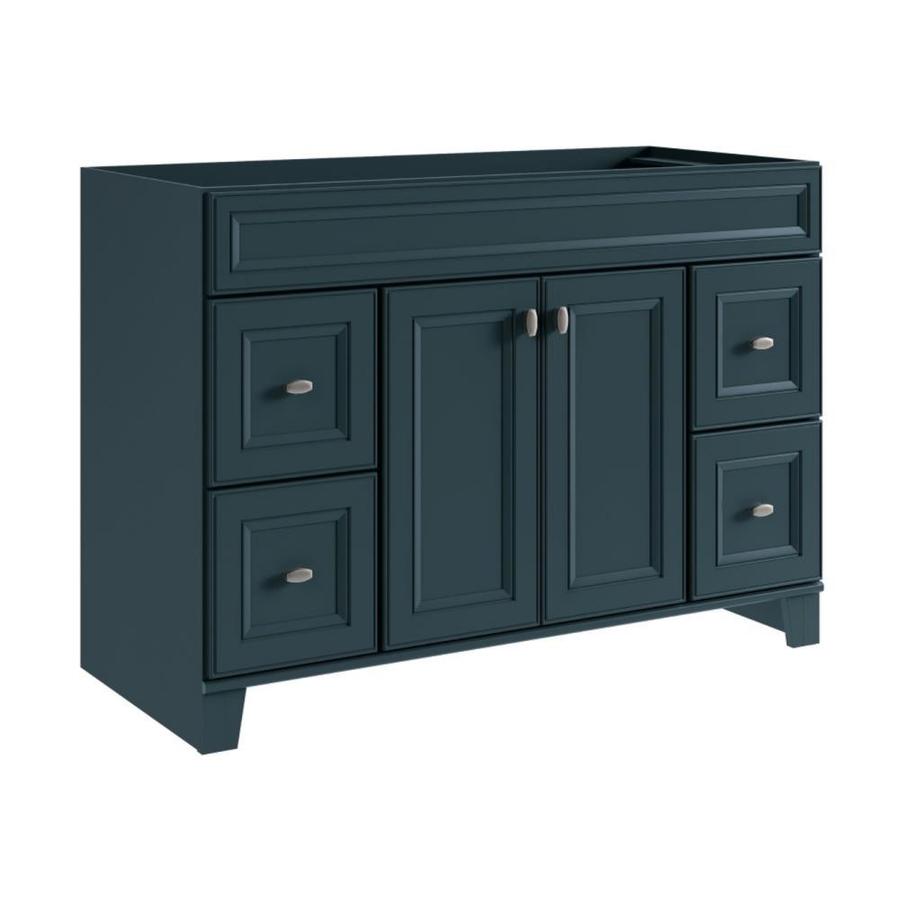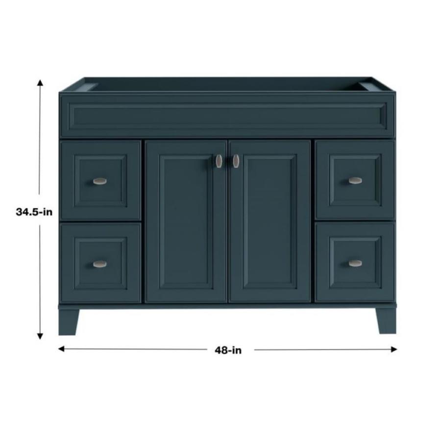 Maritime finish vanity from the Goslin collection blends well with most bath decor 48-In W x 21-in D x 34.5-in H vanity, perfectly sized for any bathroom Features 4 full-extension drawers and 2 cabinet doors Compatible with 49-in W x 22-in D vanity tops (sold separately) Brushed-nickel finish hardware adds a touch of shine Fully assembled and ready to be installed Ideal for the transitional home, blending with everything from traditional to modern styling