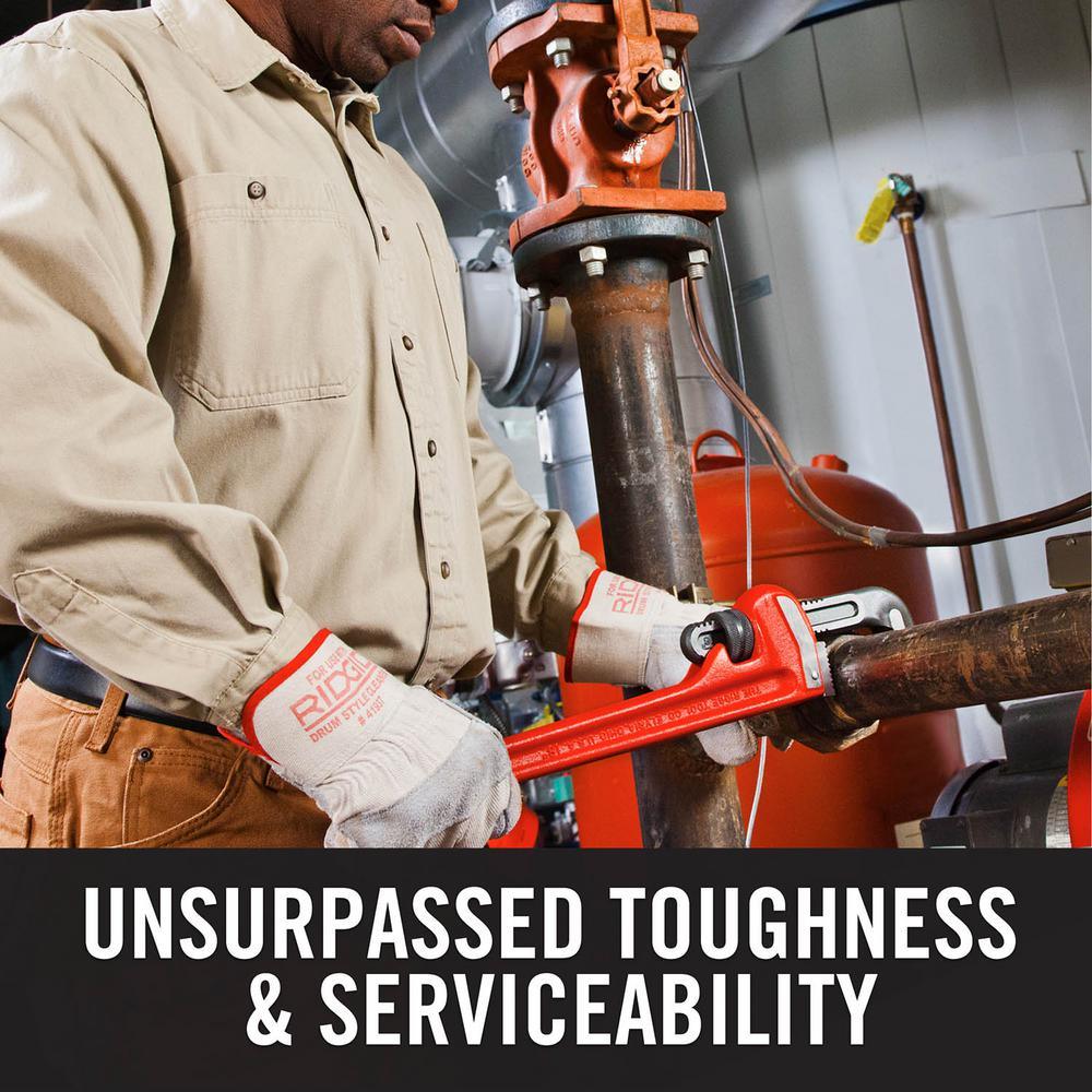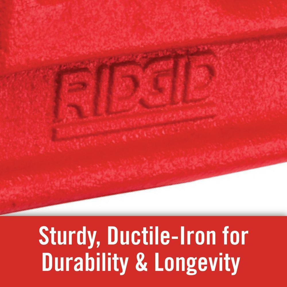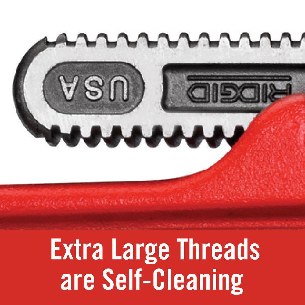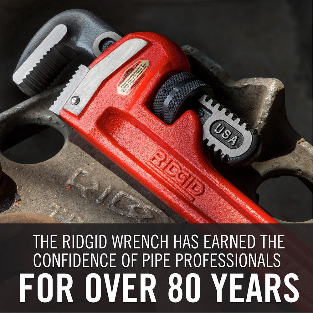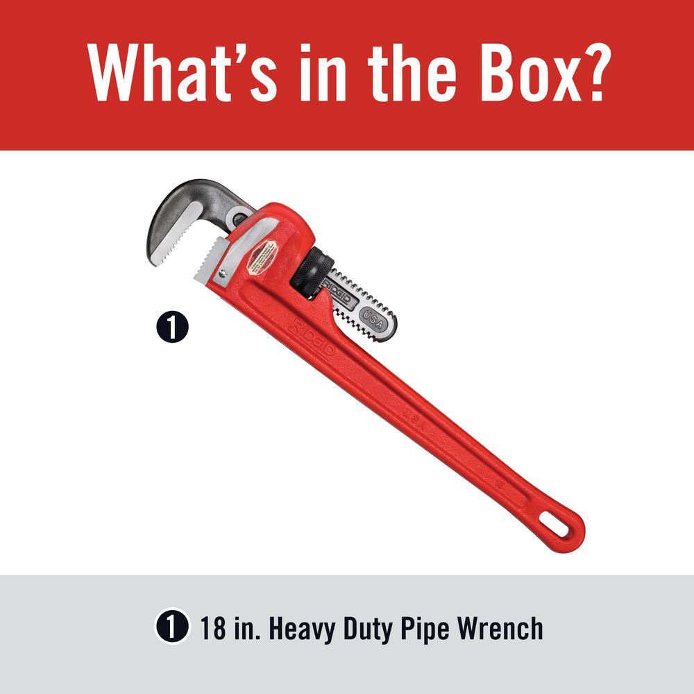 A useful addition to any plumber's toolbox, the RIDGID 18 in. Heavy-Duty Straight Pipe Wrench is a plumbing wrench that features sturdy ductile-iron housing and an I-beam handle for exceptional durability and leverage. This RIDGID pipe wrench has a quickly adjustable full-floating forged hook jaw featuring self-cleaning threads and easily replaceable spring assembly, hook jaw and heel jaw. A versatile plumbing tool, this straight pipe wrench is suited to all types of pipe work and comes in a convenient red color that is always easy to find. This 18 in. plumbing wrench is ideal for pipe diameters of 1 in. to 2 in. with a capacity of up to 2-1/2 in.