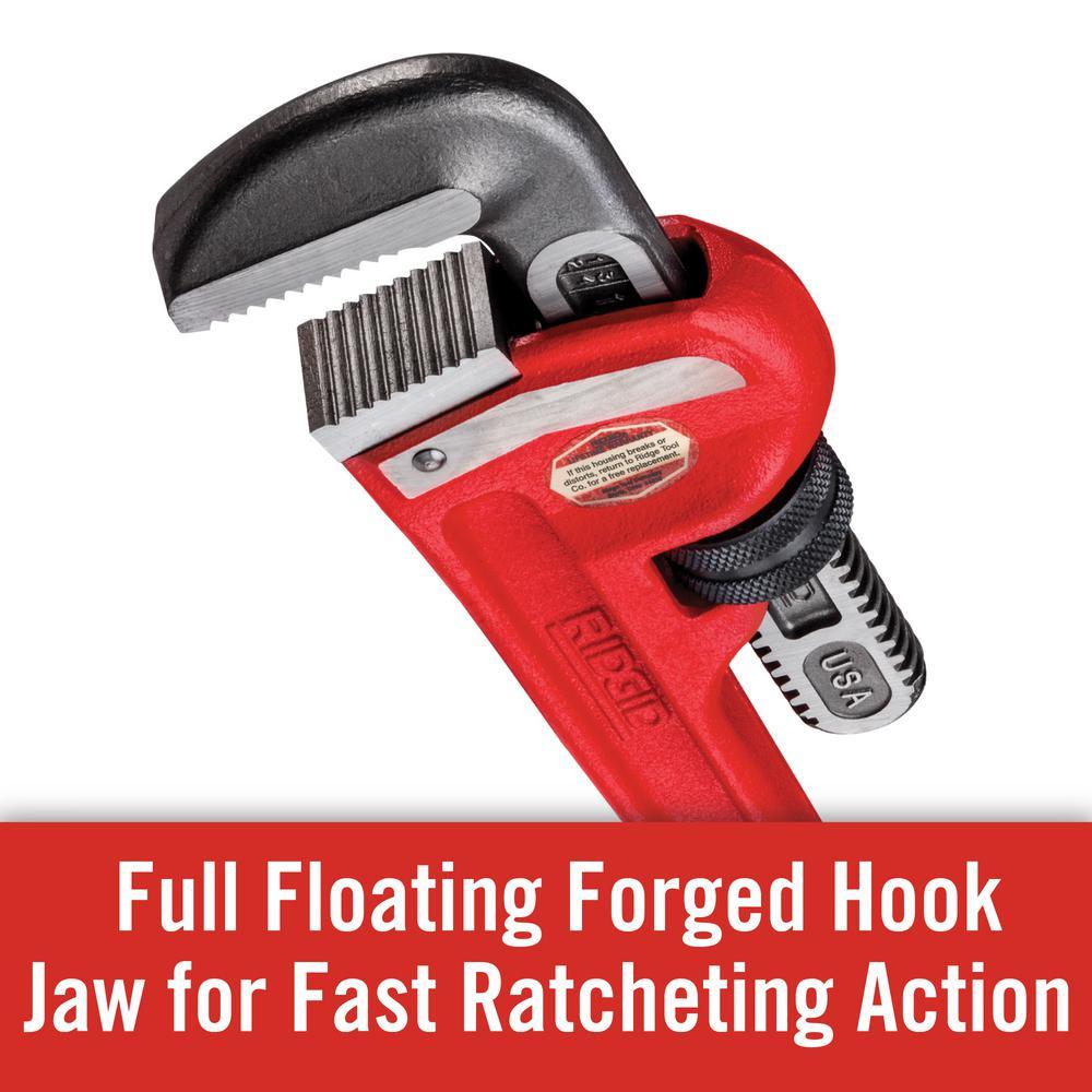 • Heavy-duty pipe wrench features a full floating forged hook jaw for superior gripping and quick adjustments