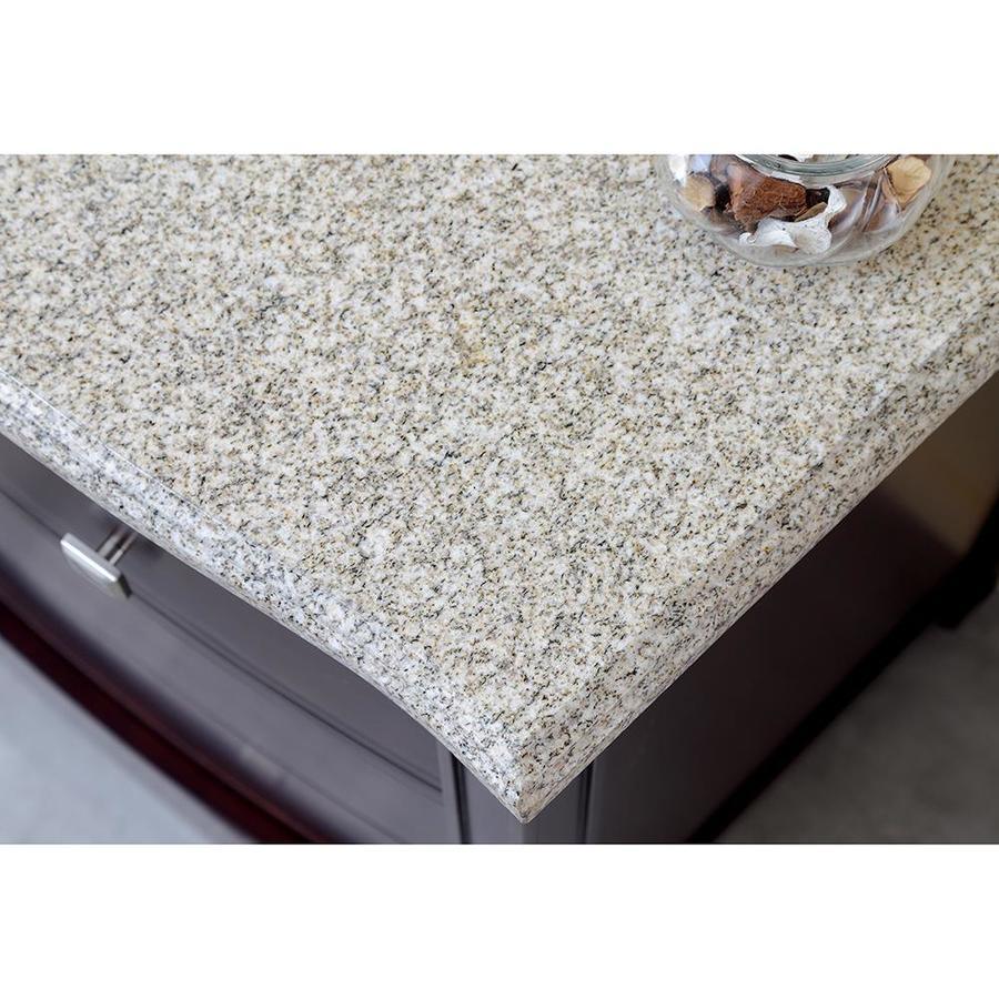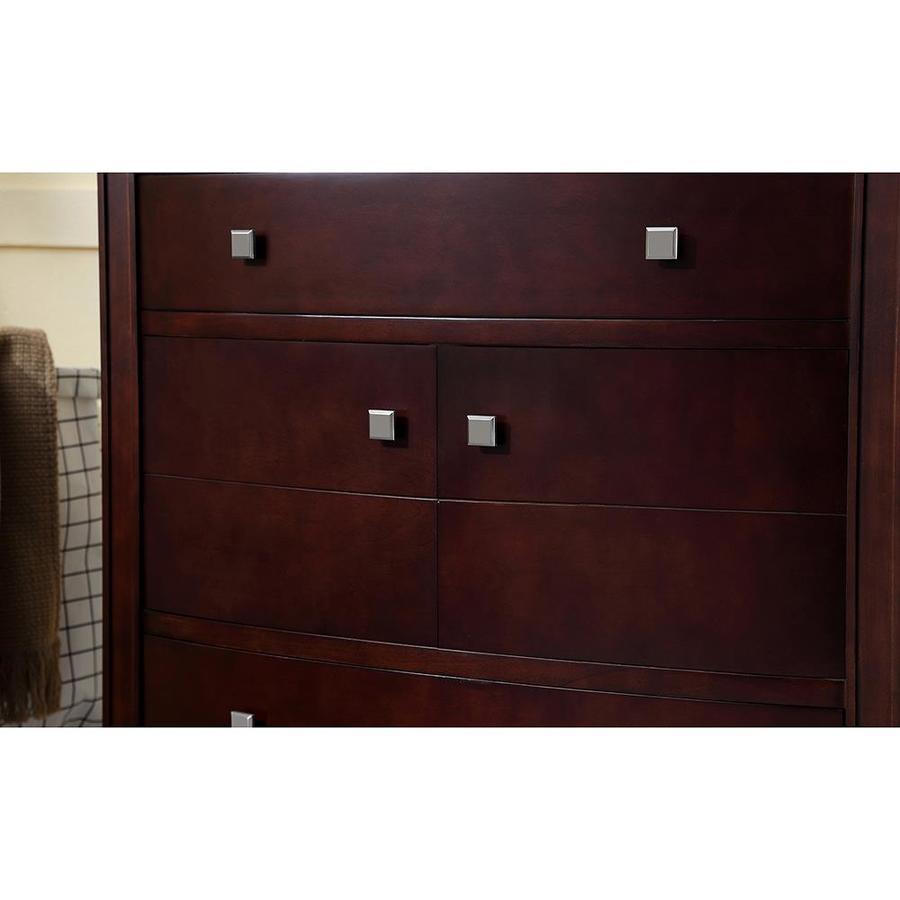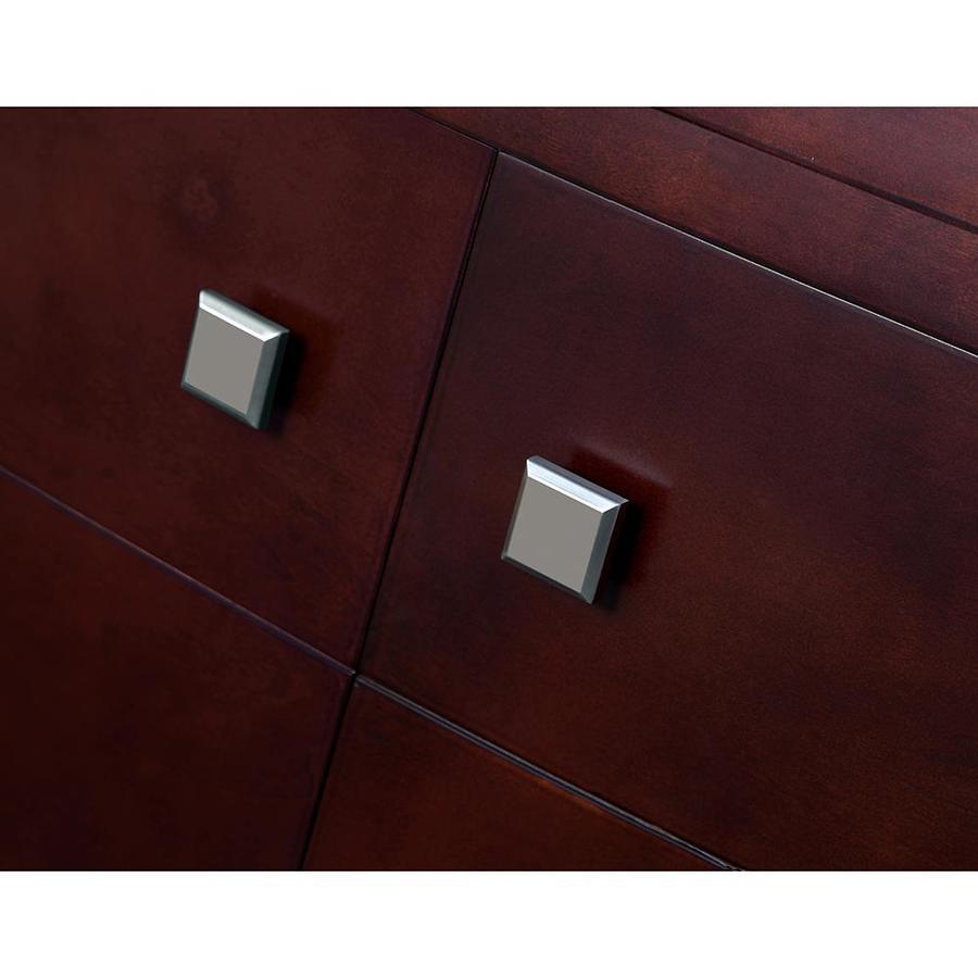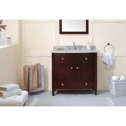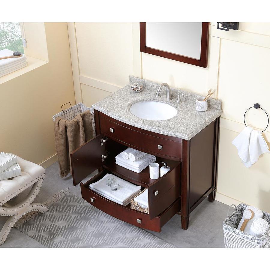 Transitionally styled bow-front cabinet works in a wide variety of bathroom decor schemes Rich tobacco brown stain highlights the natural beauty of wood Cabinet features 1 adjustable interior shelf and bottom drawer with soft-close glides for ample storage Imported granite countertop with bullnose edge and matching 3-in backsplash pairs beautifully with the vanity's warm brown tones Undermount oval ceramic sink basin, pre-drilled for 8-in faucet spread Brushed nickel square pull hardware adds timeless appeal Concealed 3-way adjustable hinges on the 2 doors open 110 degrees for easy access One year warranty Back panel cutout for easy plumbing
