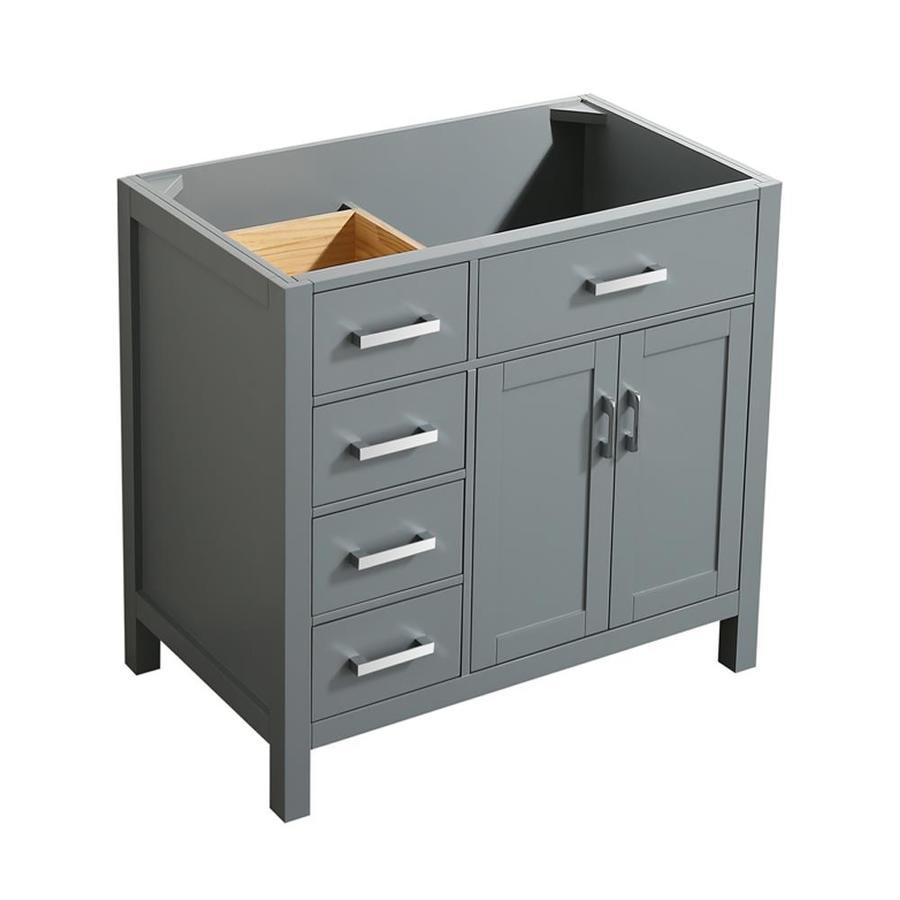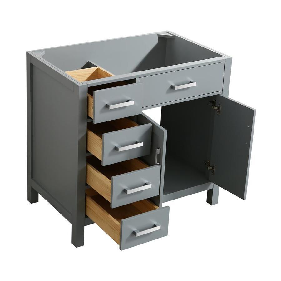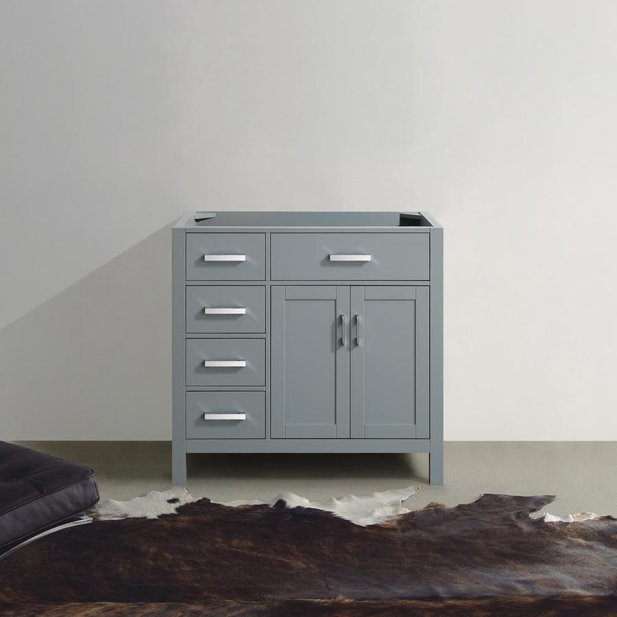 36 in. W x 21.5 in. D x 34.5 in. H Solid wood frame with MDF panels Grey painted finish 2 soft-closing doors with adjustable hinges so you'll never have to worry about hearing a door slam 4 soft-closing drawers with under-mount drawer glides to meet all your storage needs and 1 decorative faux drawer to complete the look Dove-tail construction drawer boxes for additional strength and stability Polished chrome finish hardware included Open back for easier installation Included: fully assembled base cabinet, hardware
