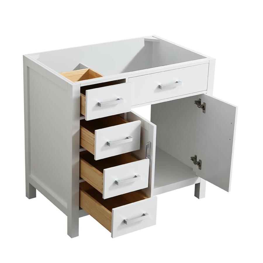 36 in. W x 21.5 in. D x 34.5 in. H Solid wood frame with MDF panels White painted finish 2 soft-closing doors with adjustable hinges so you'll never have to worry about hearing a door slam 4 soft-closing drawers with under-mount drawer glides to meet all your storage needs and 1 decorative faux drawer to complete the look Dove-tail construction drawer boxes for additional strength and stability Polished chrome finish hardware included Open back for easier installation Included: fully assembled base cabinet, hardware