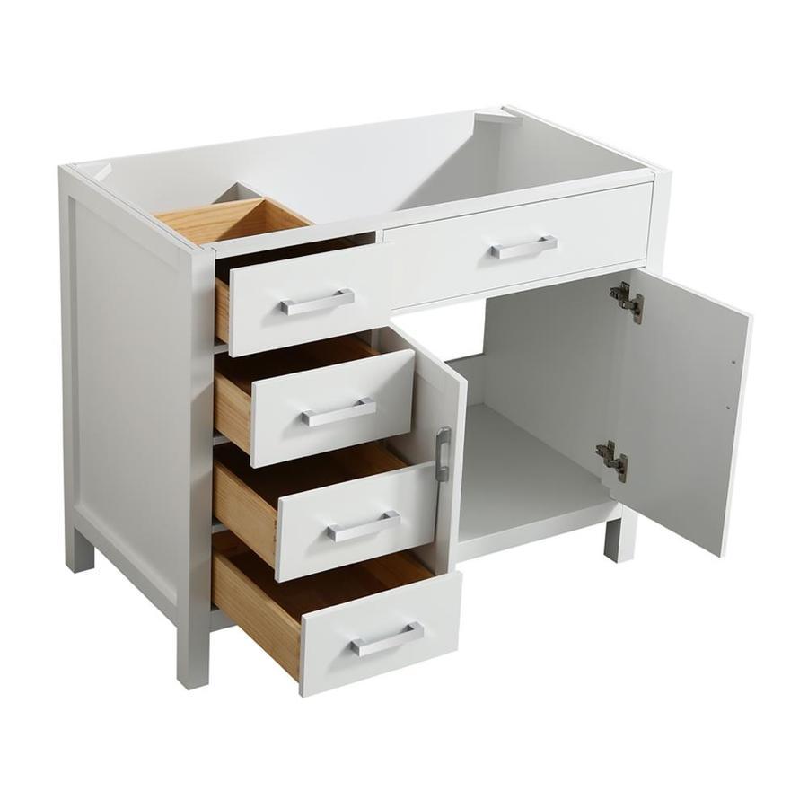 42 in. W x 21.5 in. D x 34.5 in. H Solid wood frame with MDF panels White painted finish 2 soft-closing doors with adjustable hinges so you'll never have to worry about hearing a door slam 4 soft-closing drawers with under-mount drawer glides to meet all your storage needs and 1 decorative faux drawer to complete the look Dove-tail construction drawer boxes for additional strength and stability Polished chrome finish hardware included Open back for easier installation Included: fully assembled base cabinet, hardware