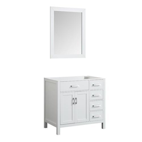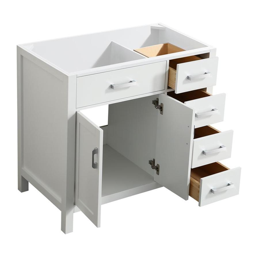 36 in. W x 21.5 in. D x 34.5 in. H Solid wood frame with MDF panels White painted finish 2 soft-closing doors with adjustable hinges so you'll never have to worry about hearing a door slam 4 soft-closing drawers with under-mount drawer glides to meet all your storage needs and 1 decorative faux drawer to complete the look Dove-tail construction drawer boxes for additional strength and stability Polished chrome finish hardware included Open back for easier installation Included: fully assembled base cabinet, hardware, mirror