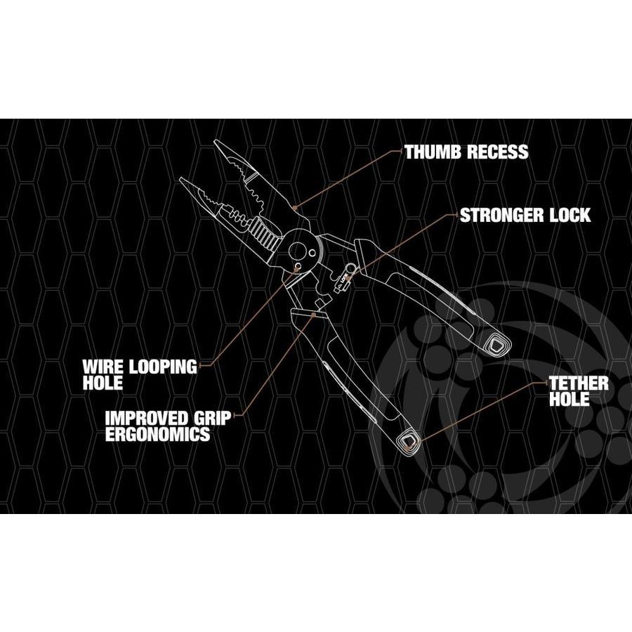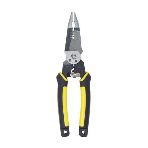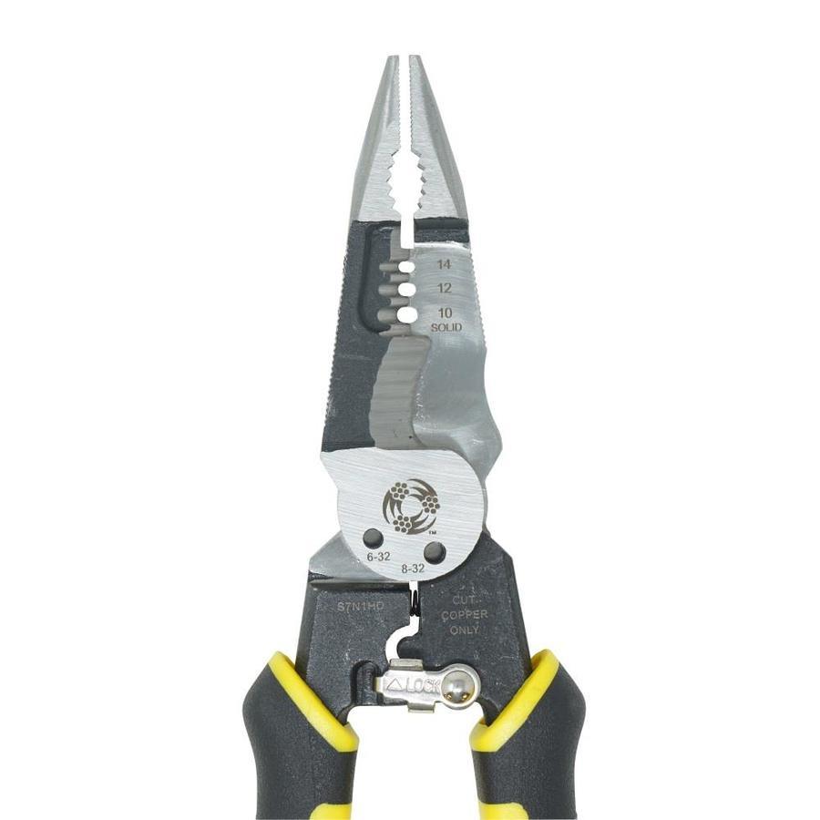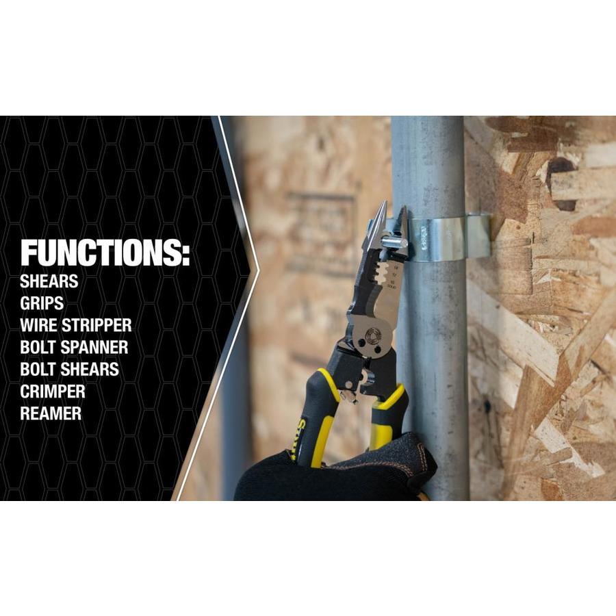 7 functions: shears, grips, strips, bolt spanner, bolt shears, crimper, reamer Strips 10 to 14 AWG solid and 12 to 16 AWG stranded wire Shears 6-32 and 8-32 bolts Heavy-duty forged steel stands up against rugged work environments Spring loaded handles Lifetime warranty