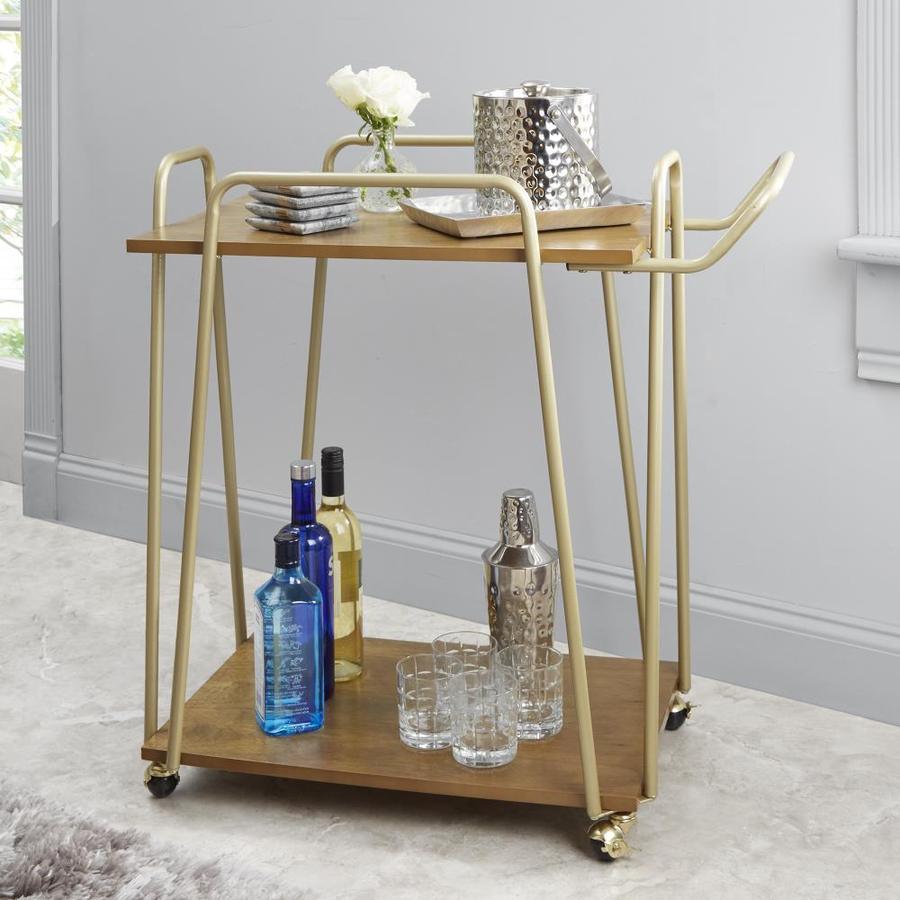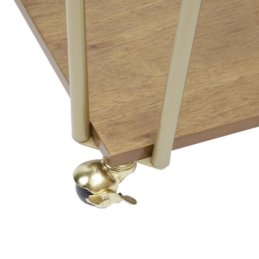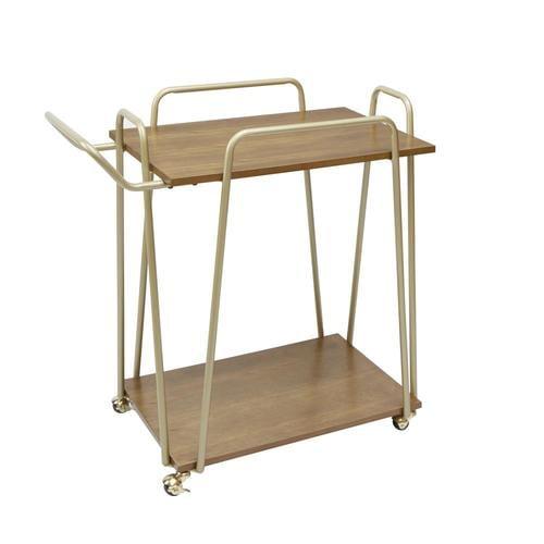 Modern bar cart with 2 rectangular wooden tiers Hairpin style frame in brilliant gold Airy design with ample open storage space Caster wheels lock in place for safe and easy use