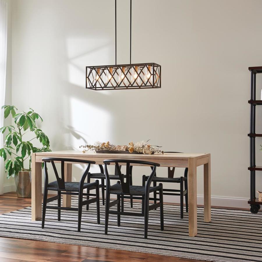 This olde bronze finish pendant is part of the Solander collection Features clear glass panels inside the olde bronze finish criss cross design outer shade Requires five 60-watt medium base bulbs (sold separately) Fixture dimensions: 10.75-in H x 32-in W x 10-in D All mounting hardware and detailed instructions are included for an easy installation ETL listing demonstrates that this fixture has met or exceeded the minimum safety standards of a widely recognized testing organization Coordinate with other Solander collection fixtures for a stunning effect
