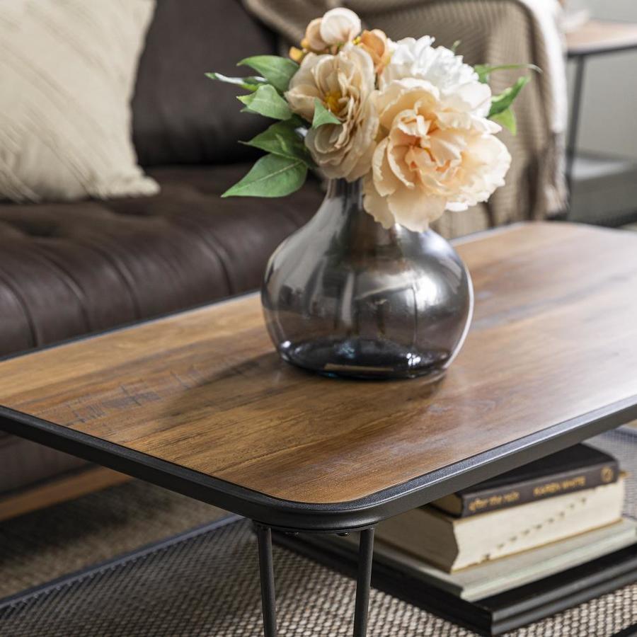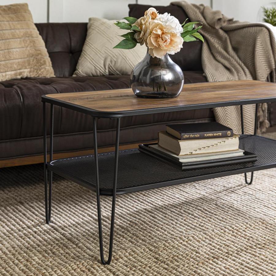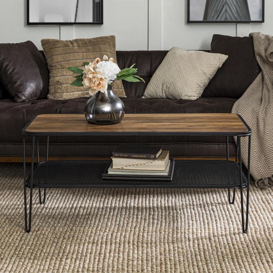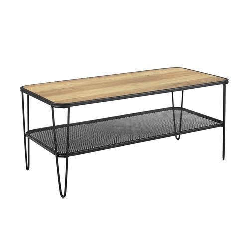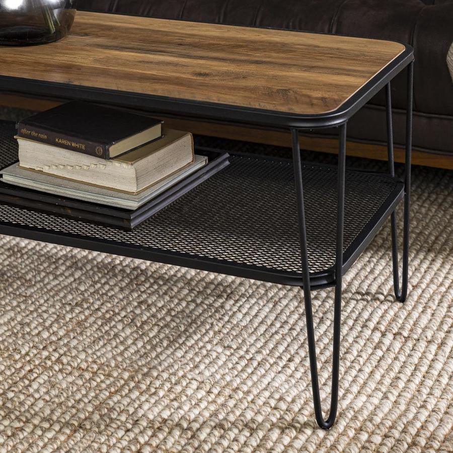 Long two-tone accent table Mid-century modern inspired hairpin legs Metal mesh lower shelf Rectangular coffee table with open storage Mixed material cocktail table Ships ready-to-assemble with step-by-step instructions