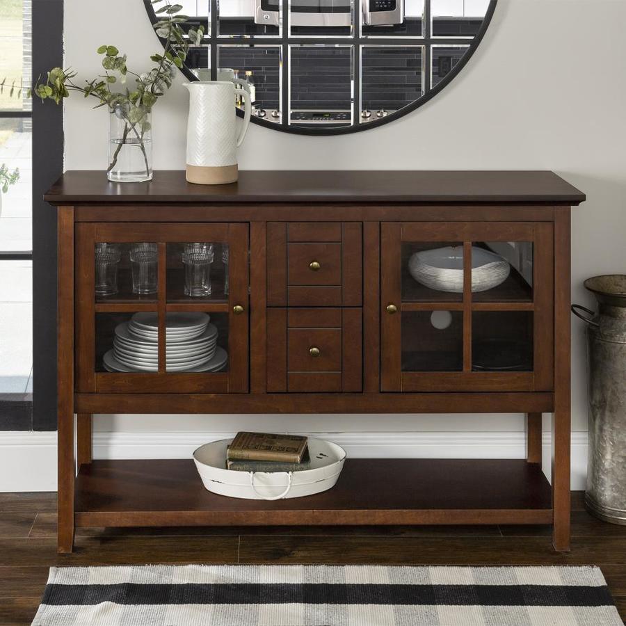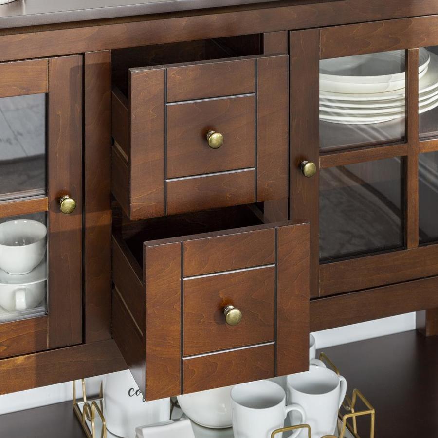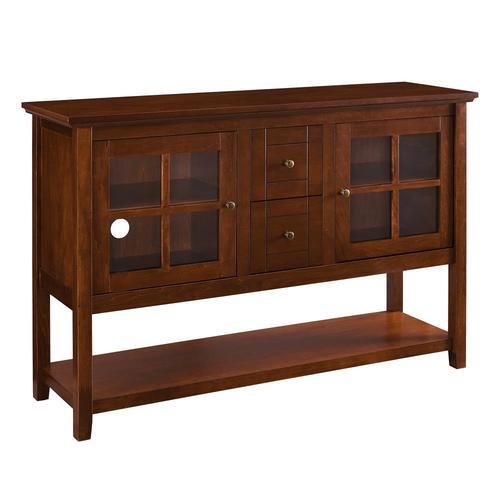In a highboy design to fit more of your media without taking up added space Made of high-grade MDF and painted in a beautiful finish Can support up to 250 pounds Featuring tempered safety glass, window paned side cabinets With adjustable shelving to fit your electronics and media perfectly Ships ready-to-assemble with step-by-step instructions