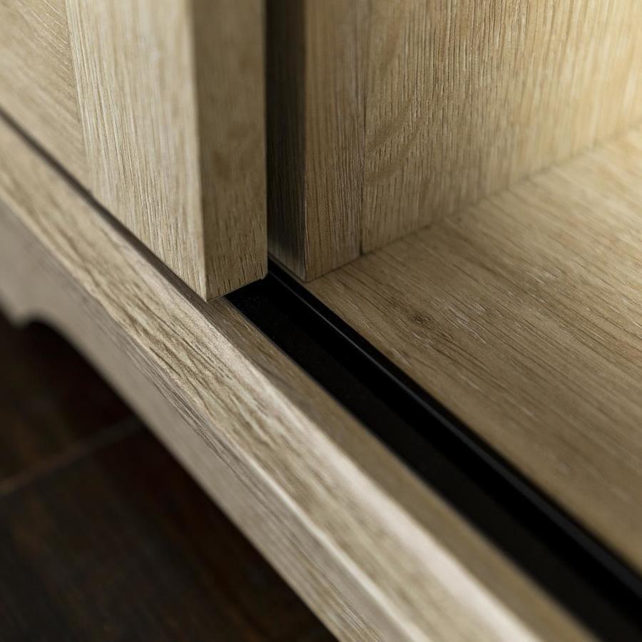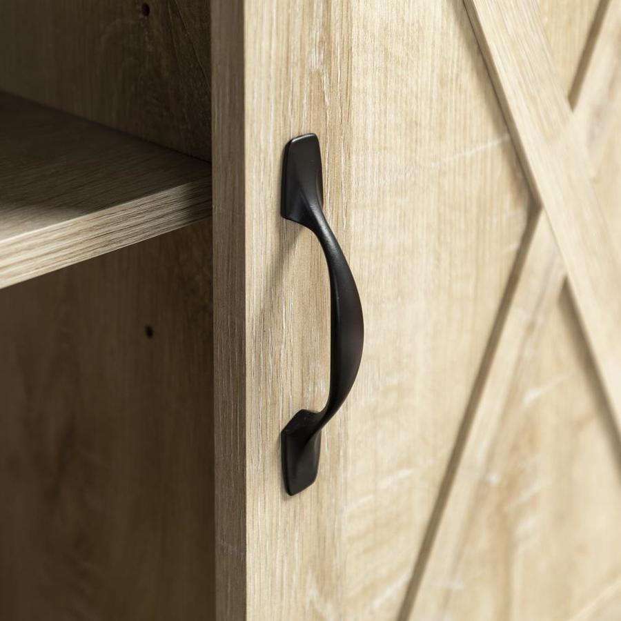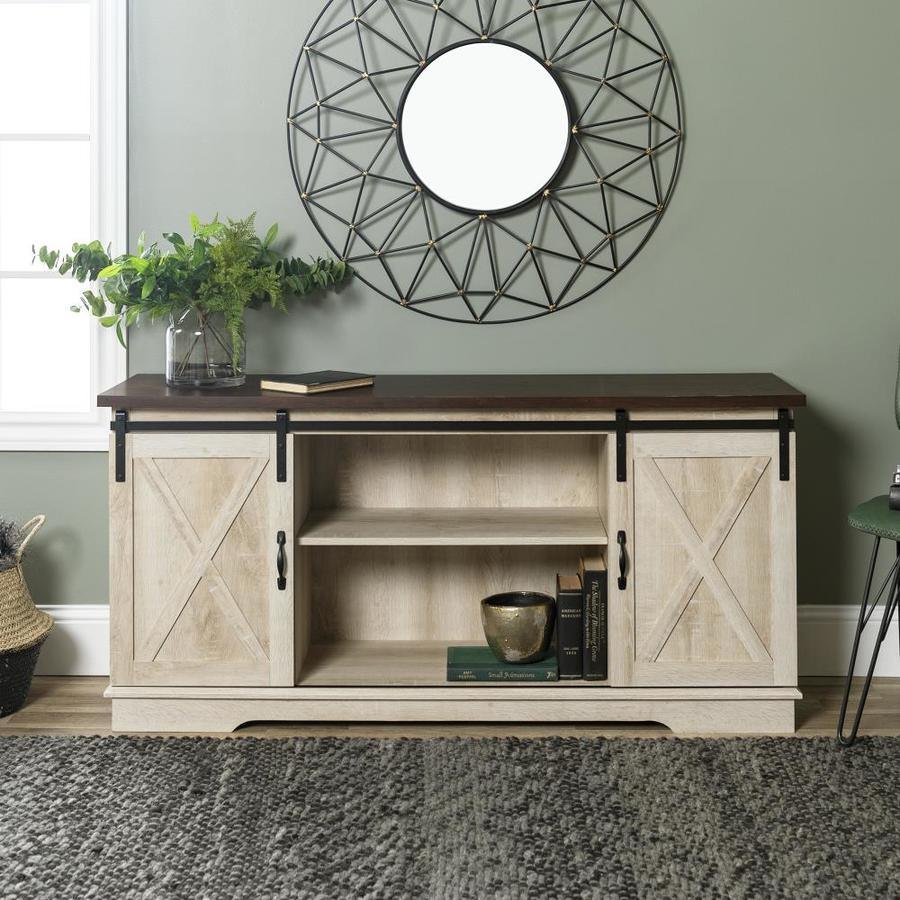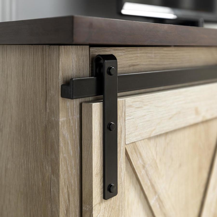 Made in a modern farmhouse design style With barn door sliding cabinet fronts for added style Made of high-grade MDF and laminate in a wood grain texture Includes cord management features in back, adjustable shelves to fit your media, and open and closed storage TV console fits up to a 64-inch TV Ships ready-to-assemble with step-by-step instructions