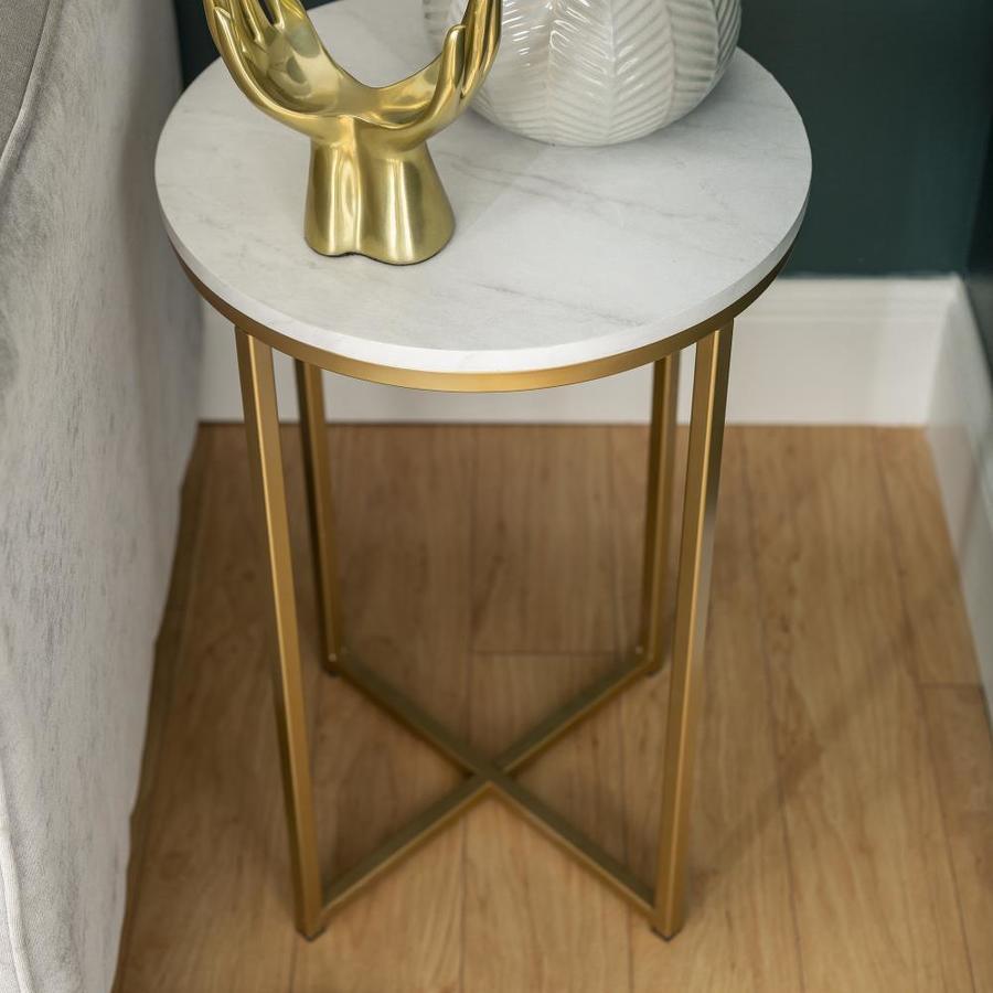 Sturdy metal frame to hold your reading material, a lamp, or dcor on the table top Metal base is painted in a gold color for a chic and glam statement Durable faux marble table top Mix of modern and glam style to add into your home Ideal as an end table or side table in your living room or nightstand in bedroom Ships ready-to-assemble with step-by-step instructions
