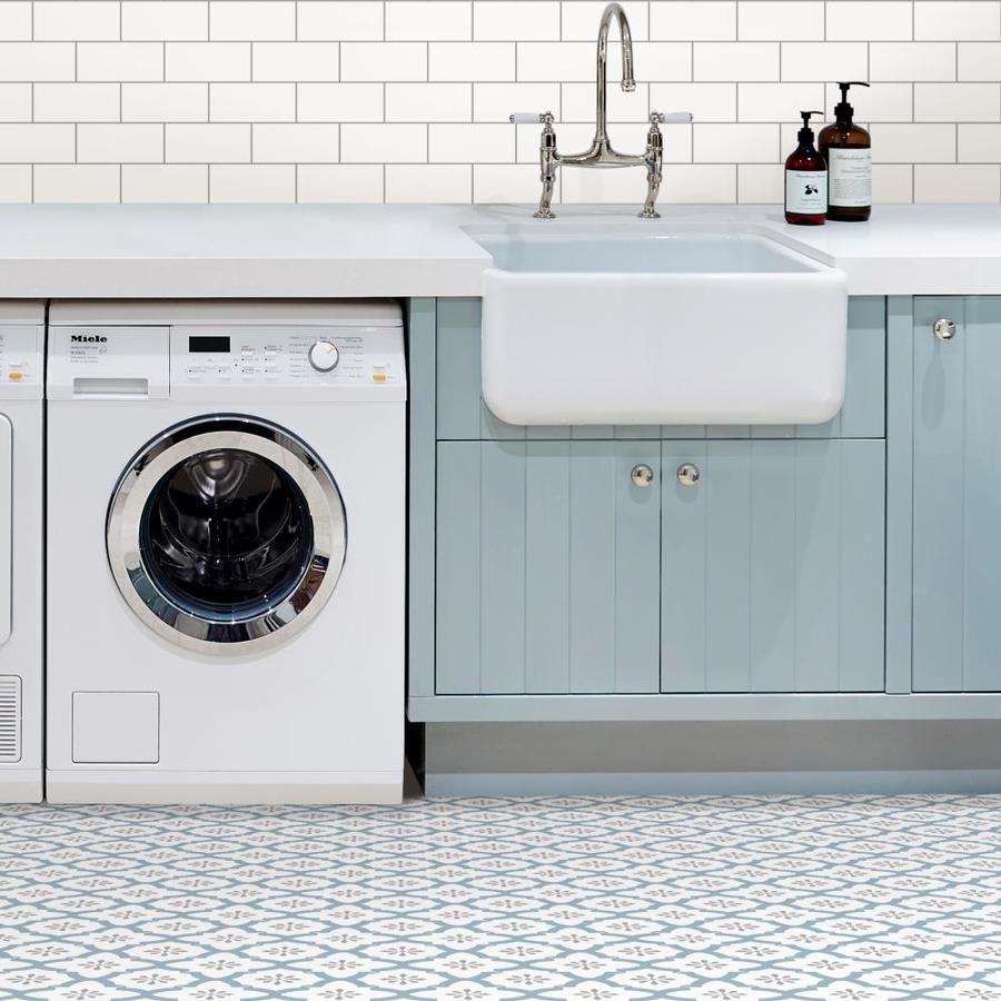 Peel and stick to apply Easy installation - no grout or special tools needed Water resistant and washable Virgin vinyl material with a textured low lustre finish and permanent adhesive makes tiles durable One package contains 20 tiles that each measure 0.06-in in depth Each tile measures 12-in x 12-inches Blue and grey peel and stick floor tile with a Farmhouse style