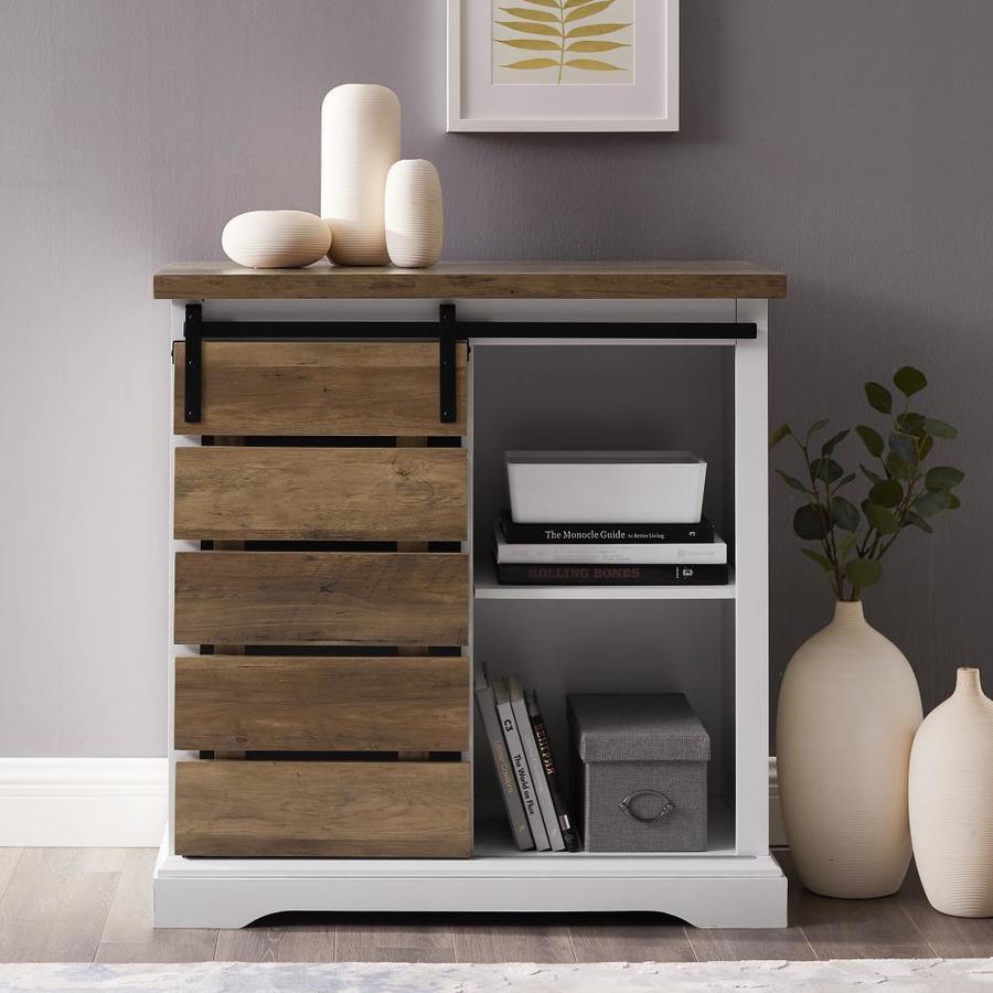 With a rustic, modern farmhouse design style for a charming country feel Made of high-grade MDF, durable laminate, and metal With a sliding door to cover either side of the console Including open and closed storage, adjustable shelves, and exposed hardware Perfect for your living room as a TV stand, in your bedroom as a storage console, or as a buffet in your kitchen Ships ready-to-assemble with step-by-step instructions
