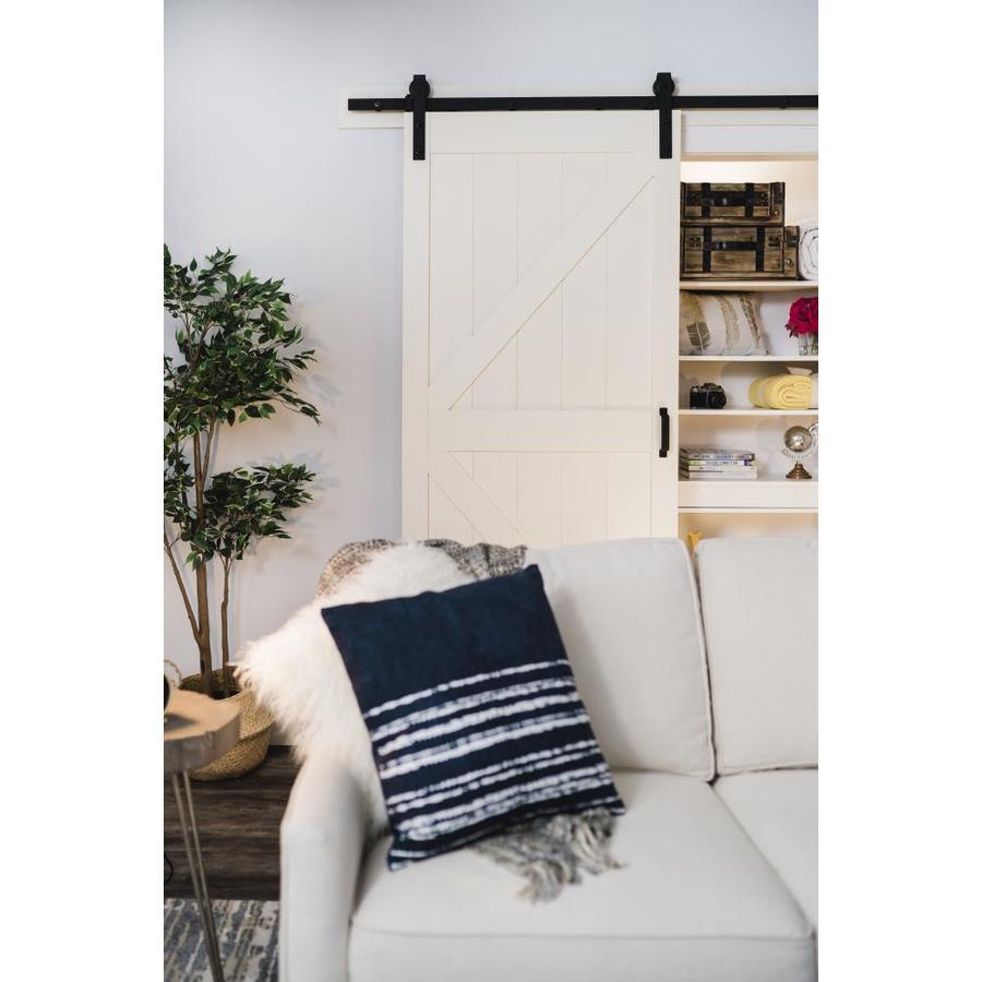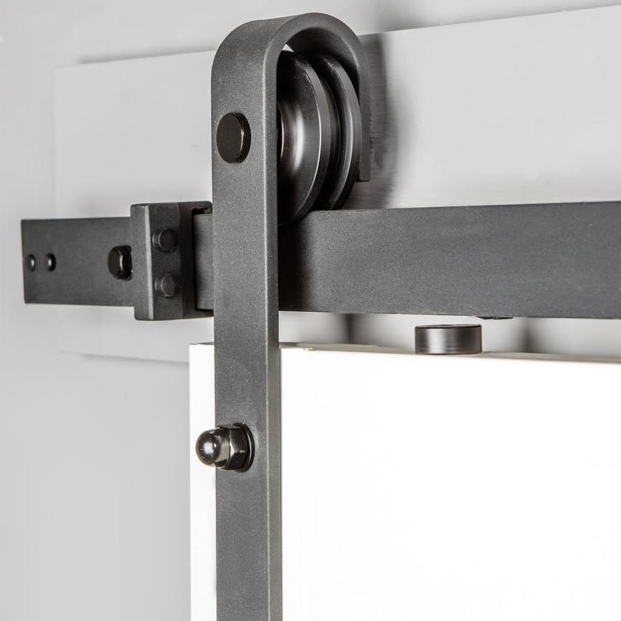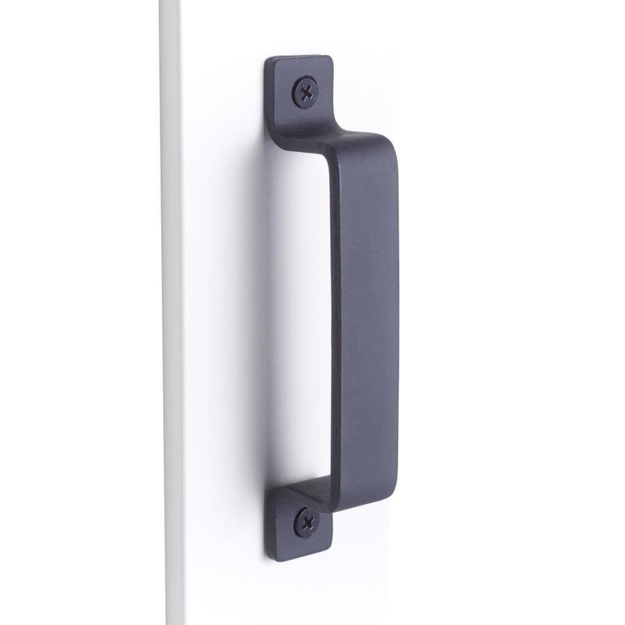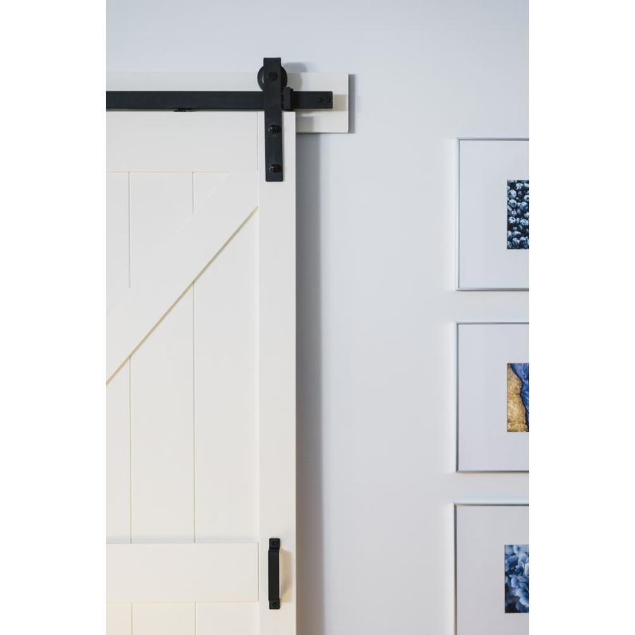 Barn door kit includes: matte black hardware, track, handle, wood backer and barn door Pre-installed Easy Glide Soft Close mechanism for a quieter and smoother closing action Trackless door design keeps floor opening clear and hazard-free Ready-to-assemble, pre-drilled mounting holes and bottom-groove guide Ideal for closets, passage ways and as room dividers Pre-finished doors are manufactured in a way that requires no further painting or staining Ideal for openings 28 in - 34 in wide The manufacturing materials used create a realistic and permanent finish that cannot be modified Engineered wood blocking mounting board supplied for drywall installation