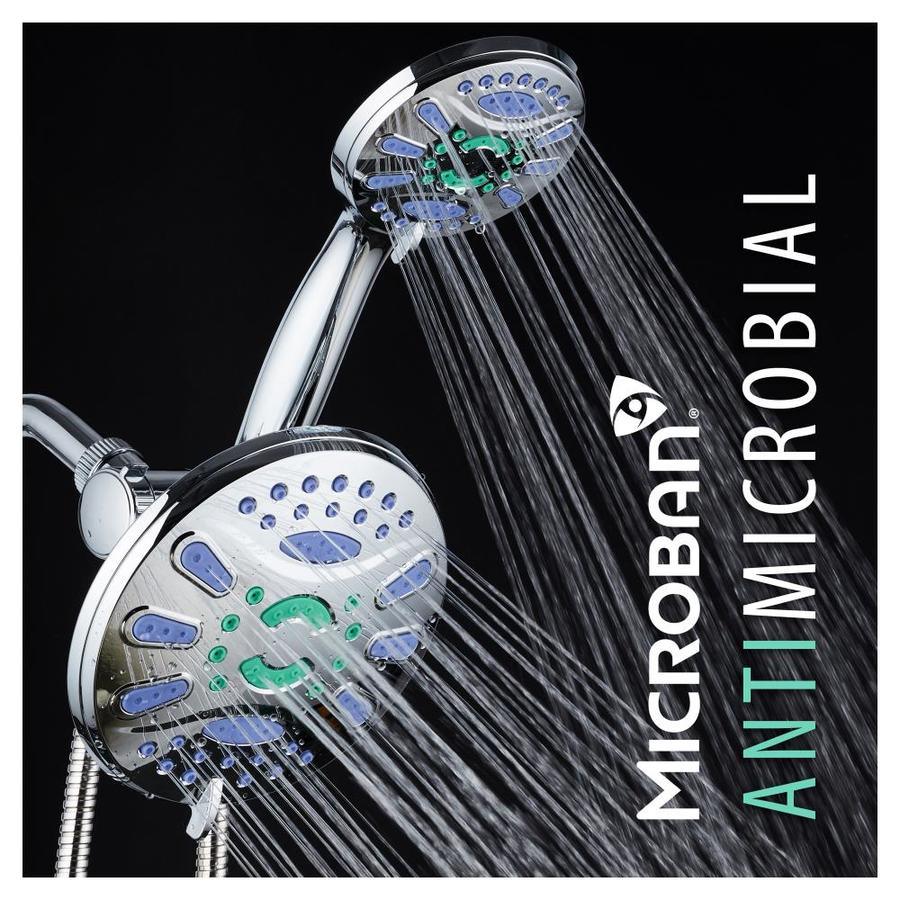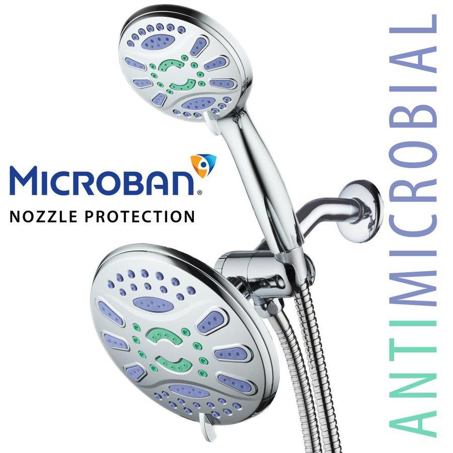 This 3-in-1 Combo offers the best of both worlds by integrating 7 in. rainfall and handheld showers in one luxurious shower spa system Use two 6-setting shower separately or together for extra-wide surround-shower™ pampering with a choice of 48 flow patterns Features antimicrobial anti-clog nozzles for more water pressure, less cleaning and better shower hygiene Enjoy pampering surround-shower™ spa experience with this luxurious 7 In. rainfall shower head and matching hand shower that can be used separately or together for a choice of 48 water flow patterns Each shower features high-power 6-setting 3-zone precision™ dial for superior water pressure and flow velocity and easy-turn click lever provides effortless flow settings 6 Flow settings of each shower include rain, massage, mist, two mixed settings and convenient water-saving pause mode for instant on/off flow control Ergonomic anti-slip hand shower handle for convenient and secure grip Easy-turn click lever for effortless flow setting selection 2-Zone antimicrobial/anti-clog nozzles inhibit the growth of mold, mildew and bacteria on their surfaces keeping them cleaner for more water pressure, less cleaning and better shower hygiene