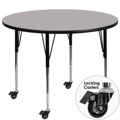 Popular Round Activity Table Scratch and Stain Resistant Surface 1.125-in Thick Thermal Fused Grey Laminate Top Black Edge Band 16 Gauge Tubular Steel Legs Black Powder Coated Upper Legs and Chrome Lower Legs Legs Adjust in 1-in Increments Locking Casters Recommended Grade Level: 1st Grade - Adult