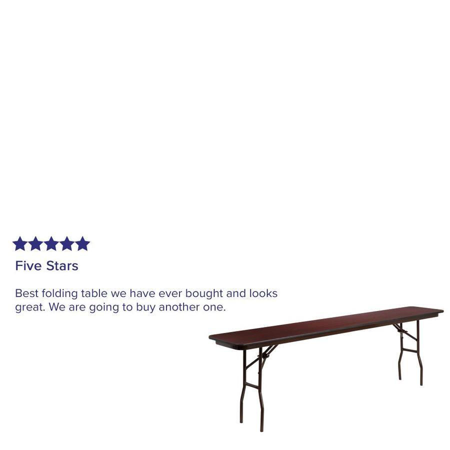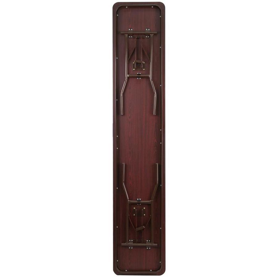 Ready To Use Commercial Table Training Style Table 8-ft Folding Table Seats up to 4 Adults 0.875-in Thick High Pressure Laminate Mahogany Top Brown T-Mold Edge Band Brown Powder Coated Pedestal Legs 18 Gauge Steel Legs Protective Floor Caps