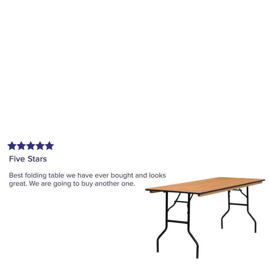 Ready To Use Banquet Table 6-ft Folding Table Seats up to 8 Adults 551 lb. Static Load Capacity 0.75-in Thick Plywood Top Black T-Mold Edge Band Black Powder Coated Wishbone Legs 18 Gauge Steel Legs Protective Floor Caps
