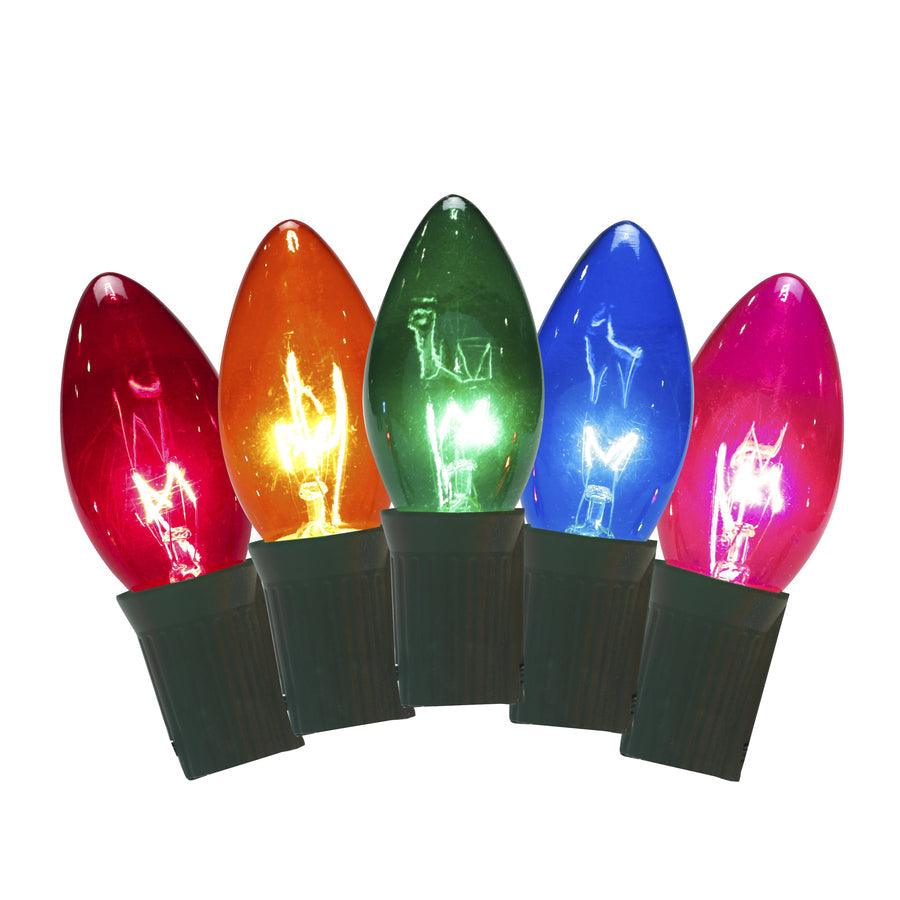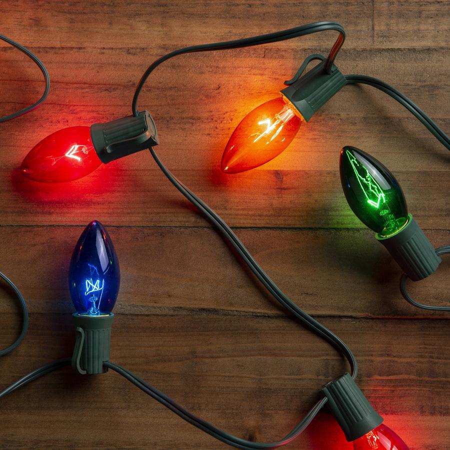 25-Light GE String-A-Long C9 multicolor light set Cool bright lights with copper screw base 7-watt 1000 hour long life bulbs 16-Feet lighted length, green cord and can connect up to 2 sets For indoor/outdoor use Replacement fuse included for added convenience