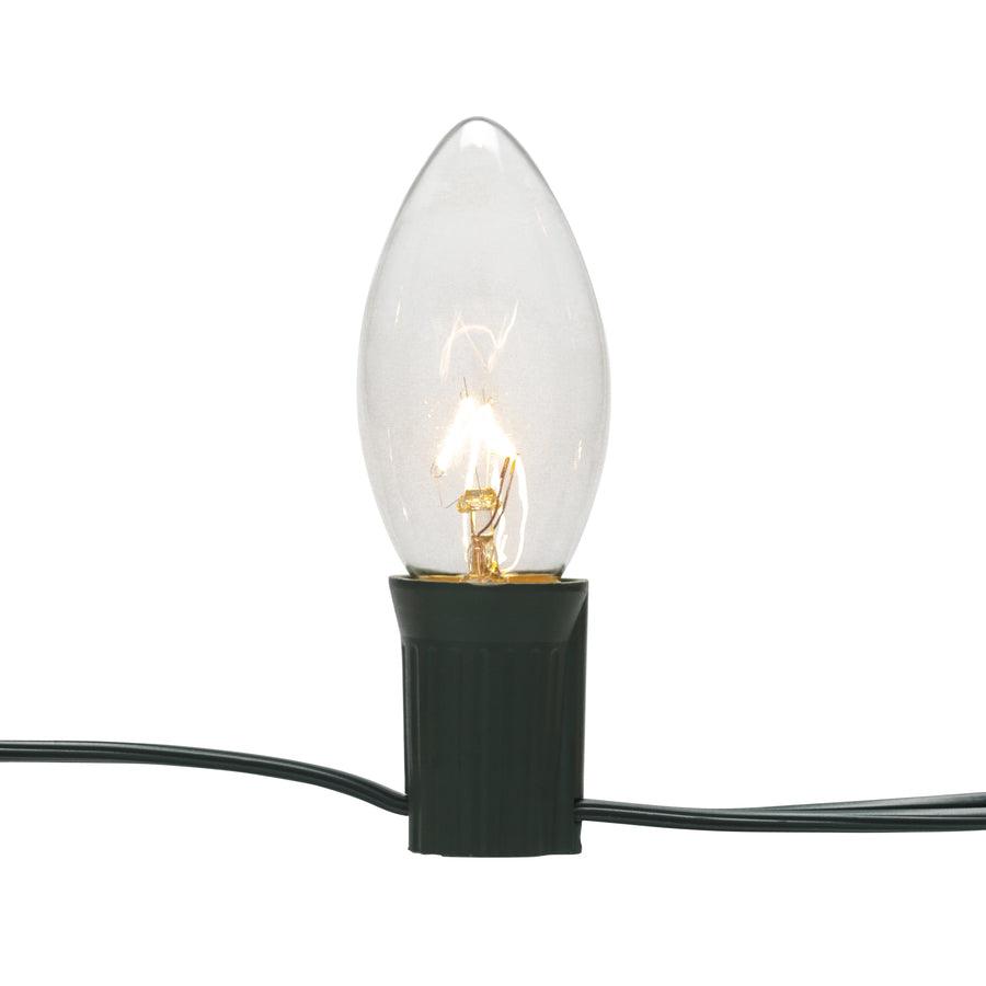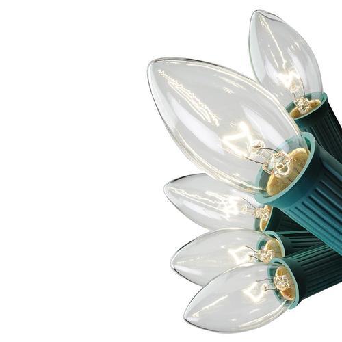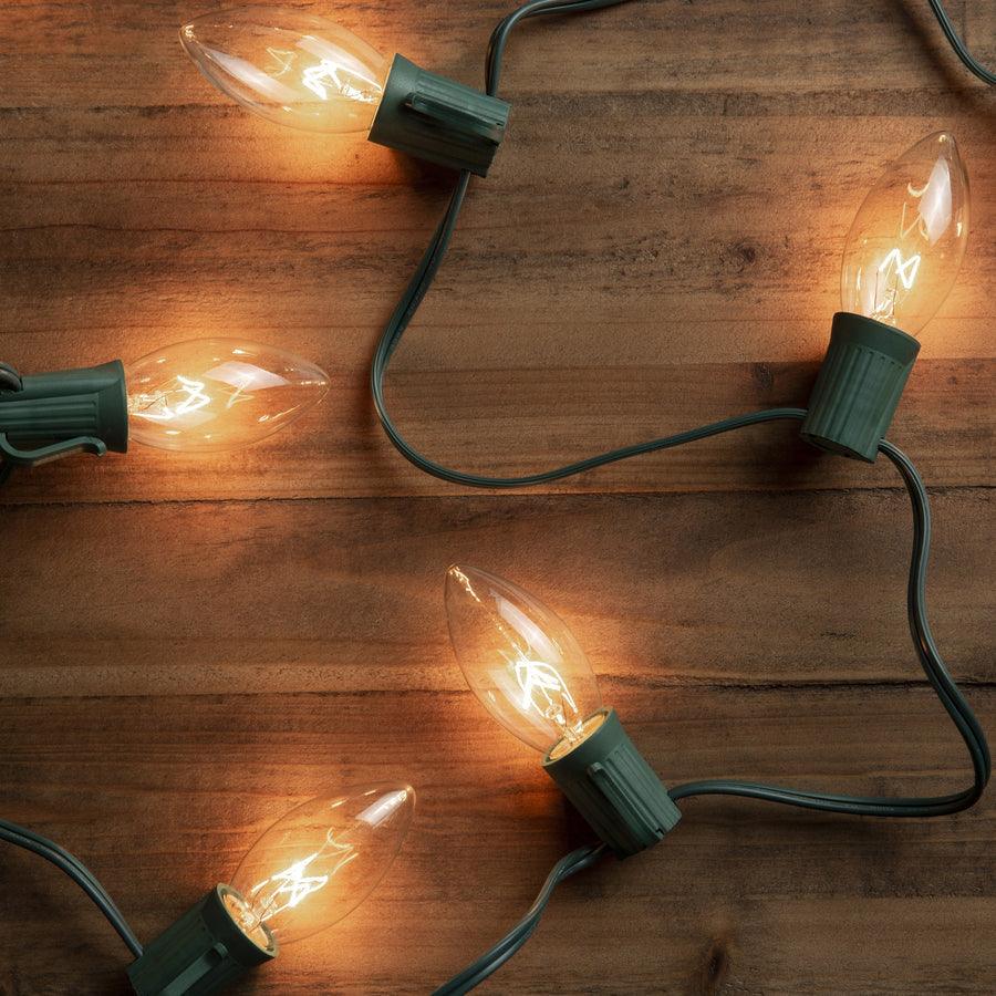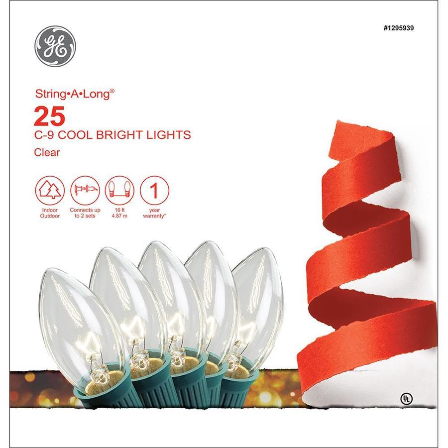 25-Light GE String-A-Long C9 clear light set Cool bright lights with copper screw base 7-watt 1000 hour long life bulbs 16-Feet lighted length, green cord and can connect up to 2 sets For indoor/outdoor use Replacement fuse included for added convenience