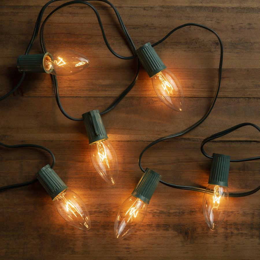 25-Count C9 string lights provide up to 1,500 hours of constant white light Green cord with 24-ft lighted length with big cap matches your holiday decor UL safety listing demonstrates this product has met minimum requirements of widely accepted product safety standards Connects up to 2 sets end to end