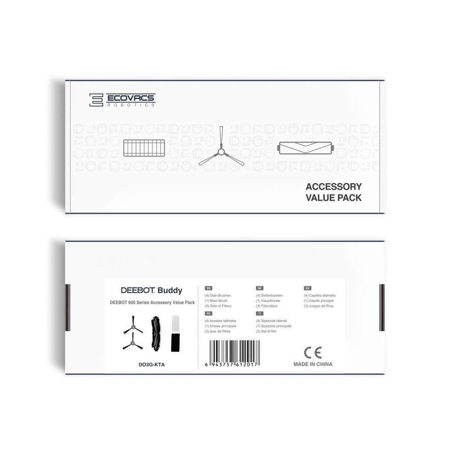 Includes 1 main brush, 4 side brushes, and 3 high-efficiency filters ECOVACS Robotics recommends on average changing the main brush once, side brushes twice, and filters three times a year Compatible with the DEEBOT 600 Robotic Vacuum and Mop Cleaner No additional tools are necessary for installation