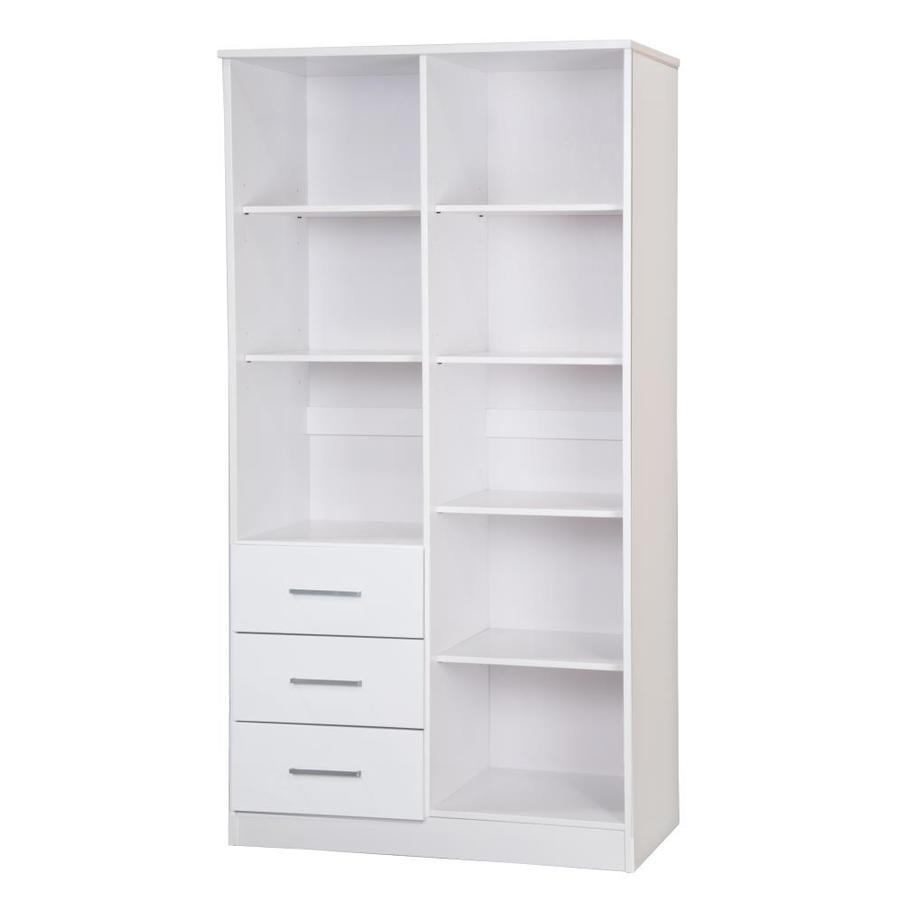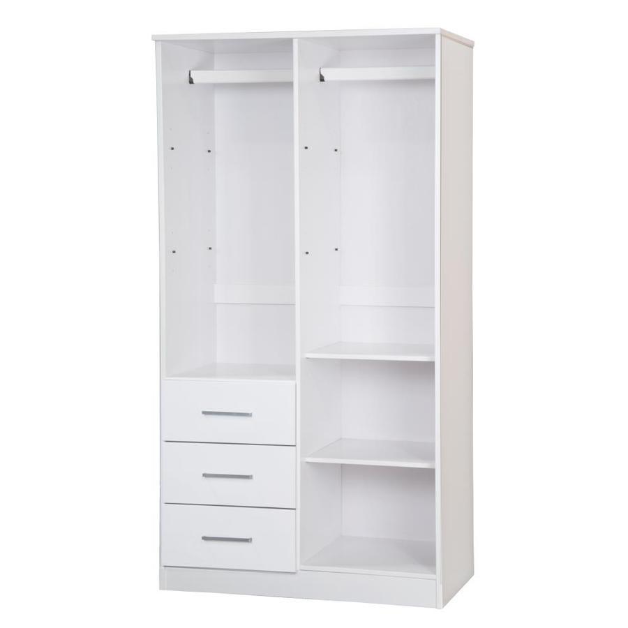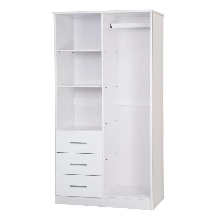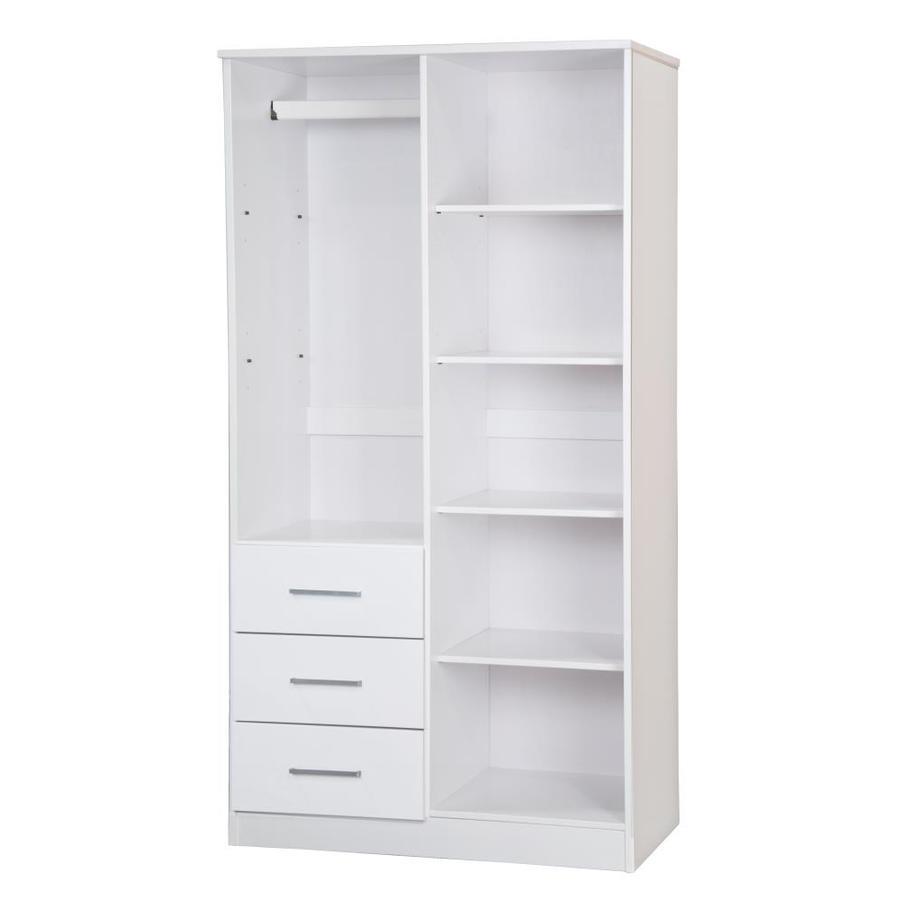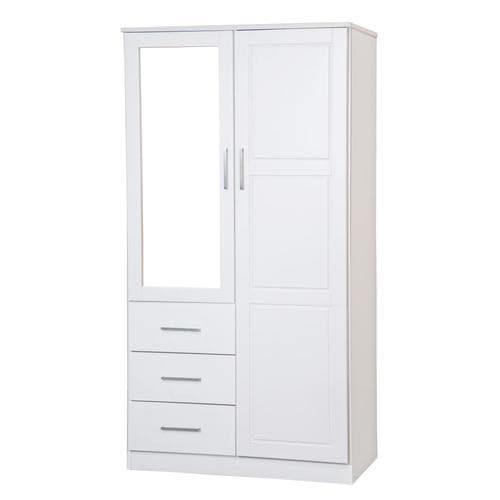 Combines visual appeal with practical storage features and built-in mirror Features drawers, clothes hanging and/or shelf space storage options
