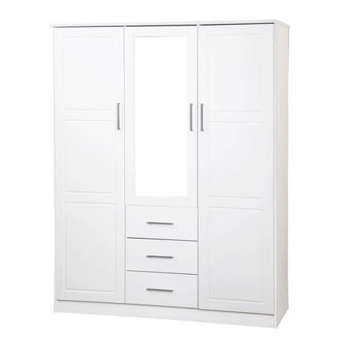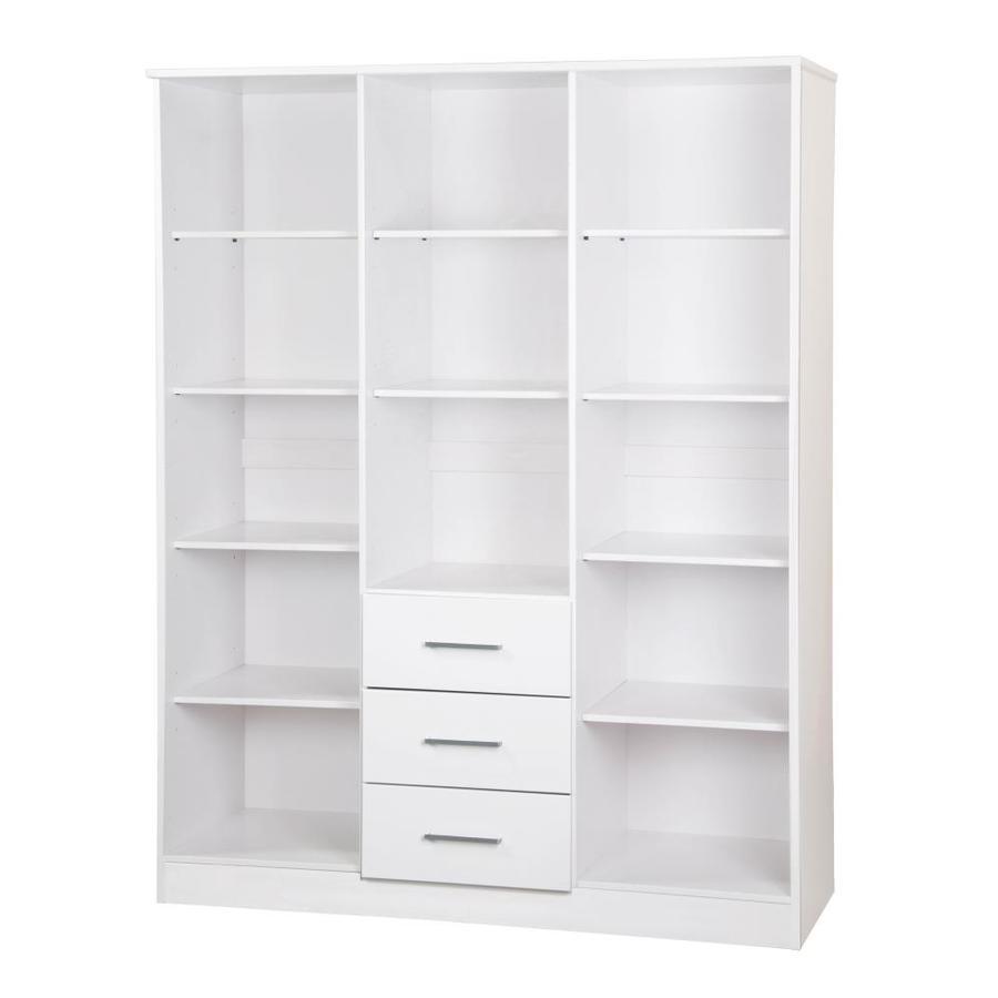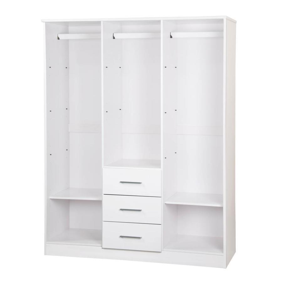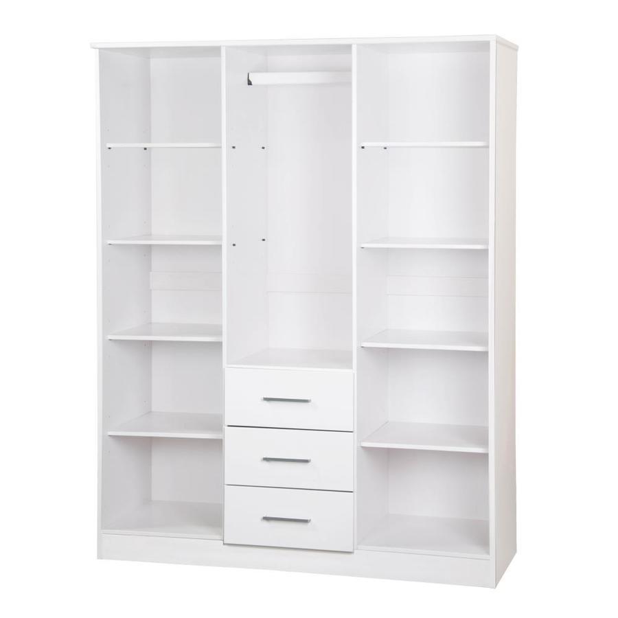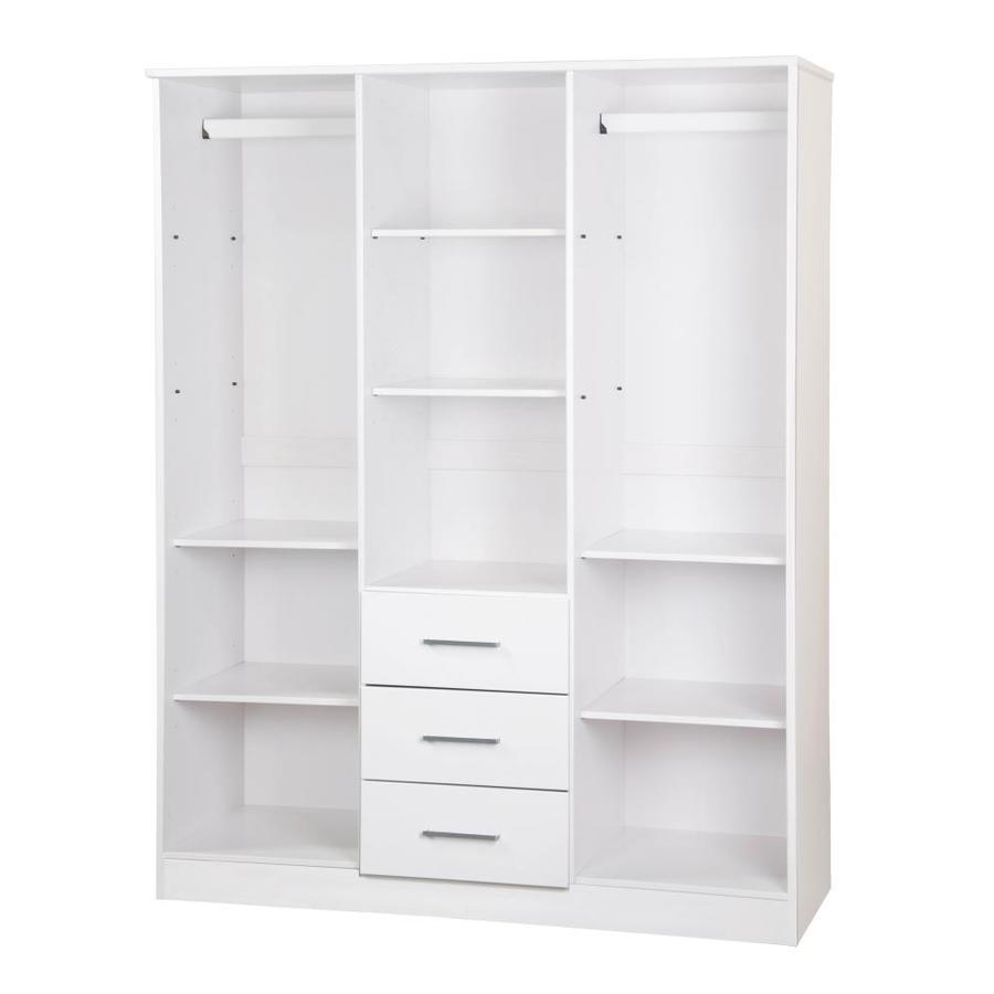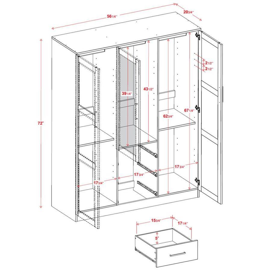 Overall Size: 56-in W x 72-in H x 20.75-in D Colors: White, Mocha, Gray, Java 40% gloss 2 shelves included (standard) Optional additional shelves sold in sets of 2 3 Clothing rods with metal supports included Middle door with framed mirror Felt floor protectors prevent floor from scratches Drawer interior dimensions: 15.75-in W x 5-in H x 17.25-in D Metal modern style brushed satin finish pulls