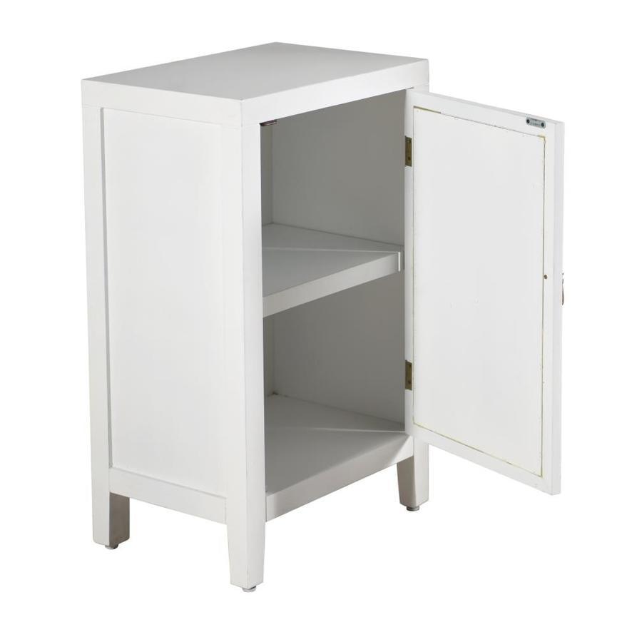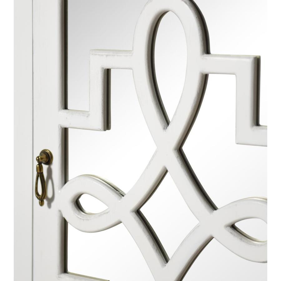 1 door cabinet with interior shelf Antique mirror front Magnetic Door latches Fully finished back Levelers on all feet Anti-tip kit included Clearance from floor to bottom - 4-in Constructed of Wood (MDF)
