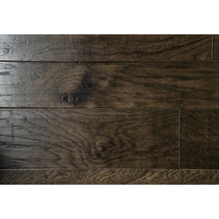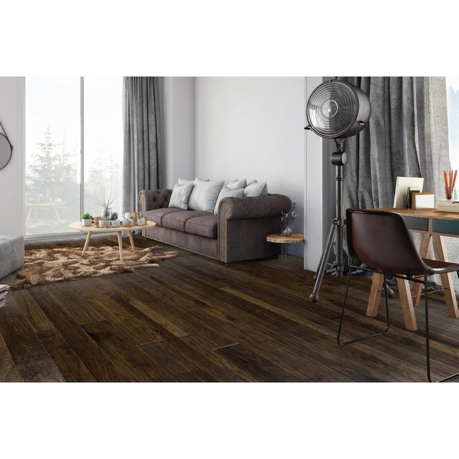 Americana Floors Barcelona collection hardwood planks are purposely designed with handscraping detail chatter markings that give the American hickory wood an individual unique artisan and vintage appearance Hand rubbed multi stain coating presents a tasteful color variation within the plank that brings out the richness of colors, character and natural looks of the wood The engineered wood’s multi layer processes balance the product thus offering a more stable reaction to both moist and dry environments With Janka 4 hardness rating, this collection’s 11 step aluminum oxide finish offers protection from impact to the raw material and thus reduction in scratching and scuffing Random plank sizes allow for varying ways to lay out and configure the pieces for creative looks adding interest and design to your flooring area The 3/8-in thick planks are provided in mixed widths (common 3-in, 5-in, and 6-1/2-in packaged together) covering 43 sq ft per carton Semi gloss finish provides clarity and brings out the striking wood grain patterns and natural characteristics Versatile product installation at above grade or on grade with optional staple or glue applications 35 year limited residential warranty for peace of mind