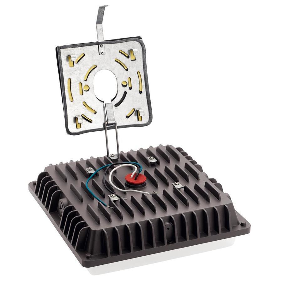 Integrated LED light source, 4000K Constructed of aluminum Ideal for high bay garages, outdoor overhangs, or barns Suitable for wet locations