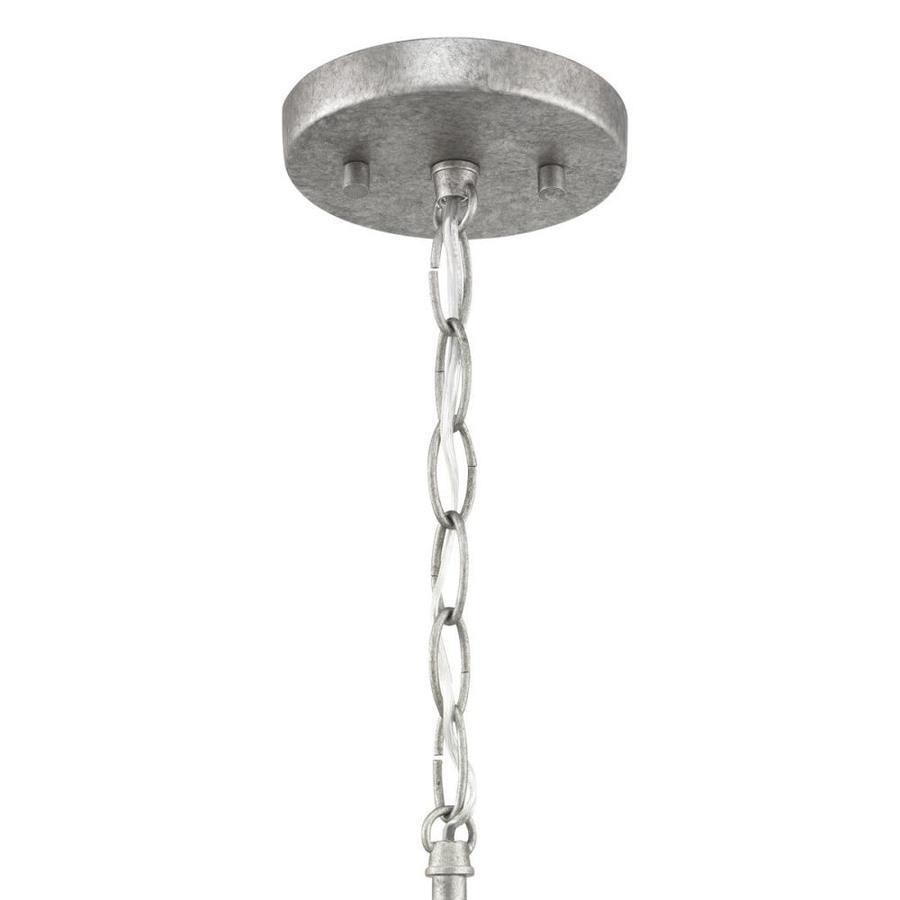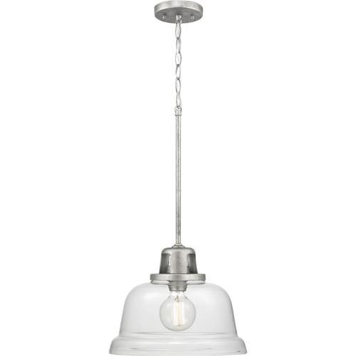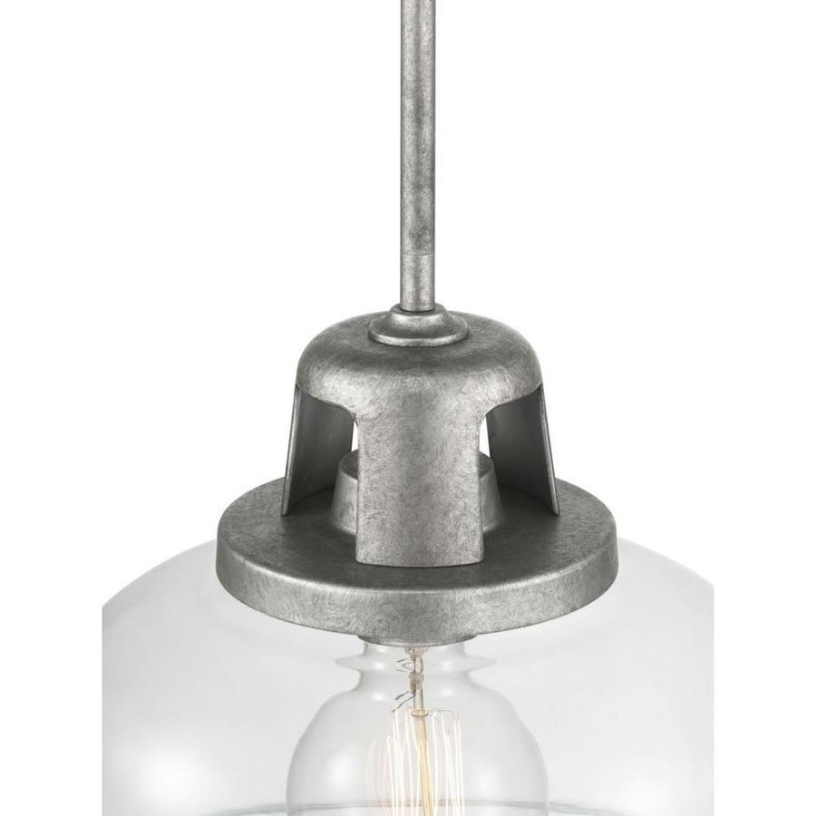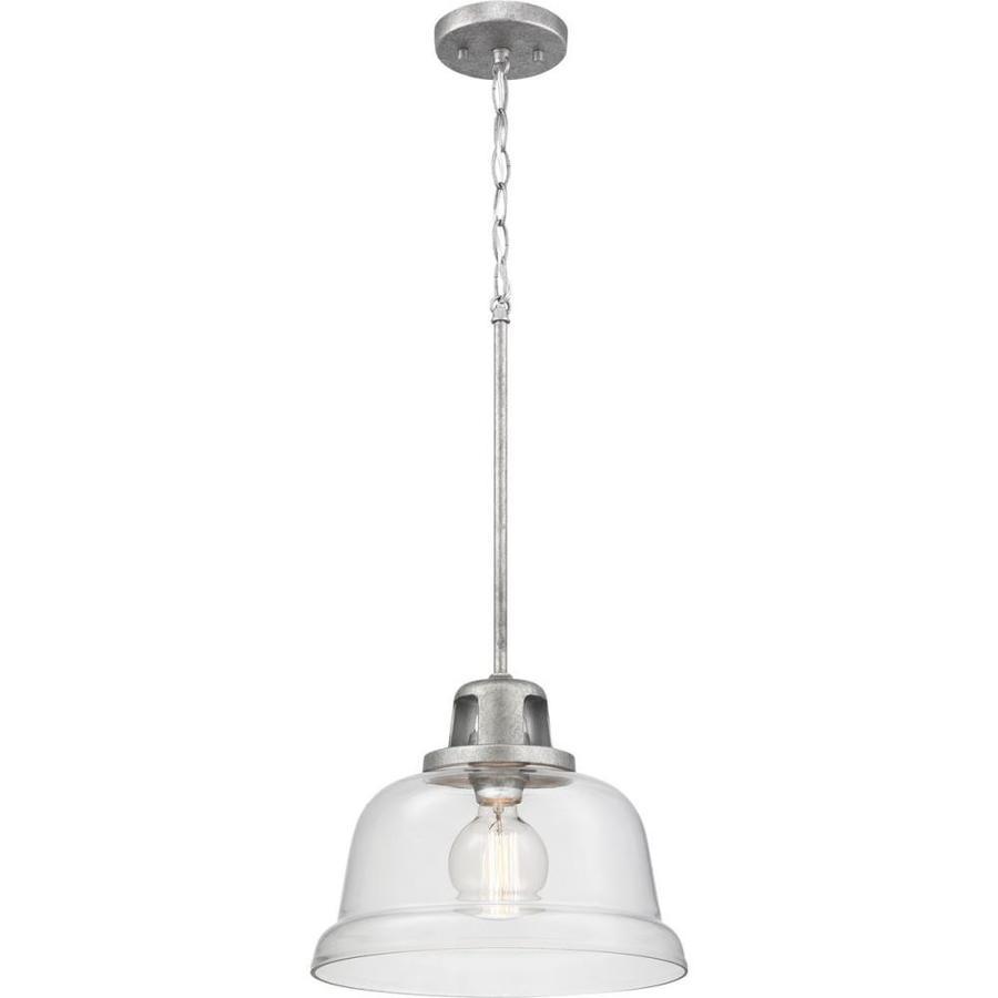 A gorgeous galvanized metal finish adds a pinch of vintage charm Light shines from every angle through the clear bell-shaped shade topped with vintage metal detailing The shade surrounds a simple light base Pendant offers a stylishly simple design Uses (1) 60-watt medium base bulb (not included) 14 In. diameter x 11-3/4 In. height