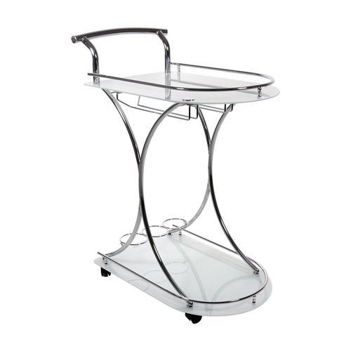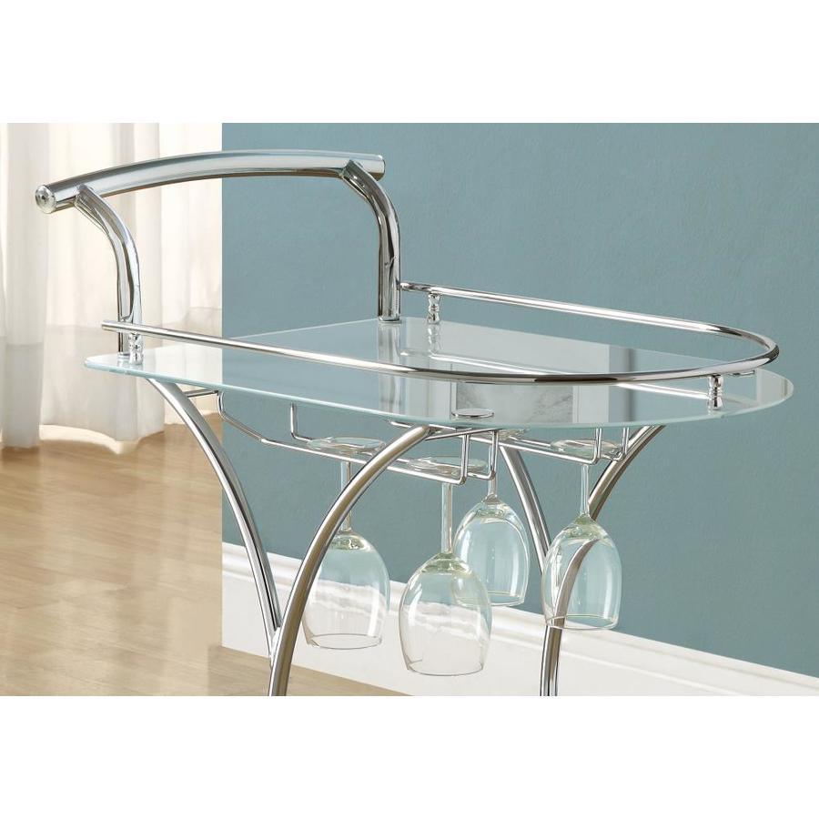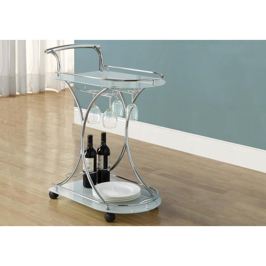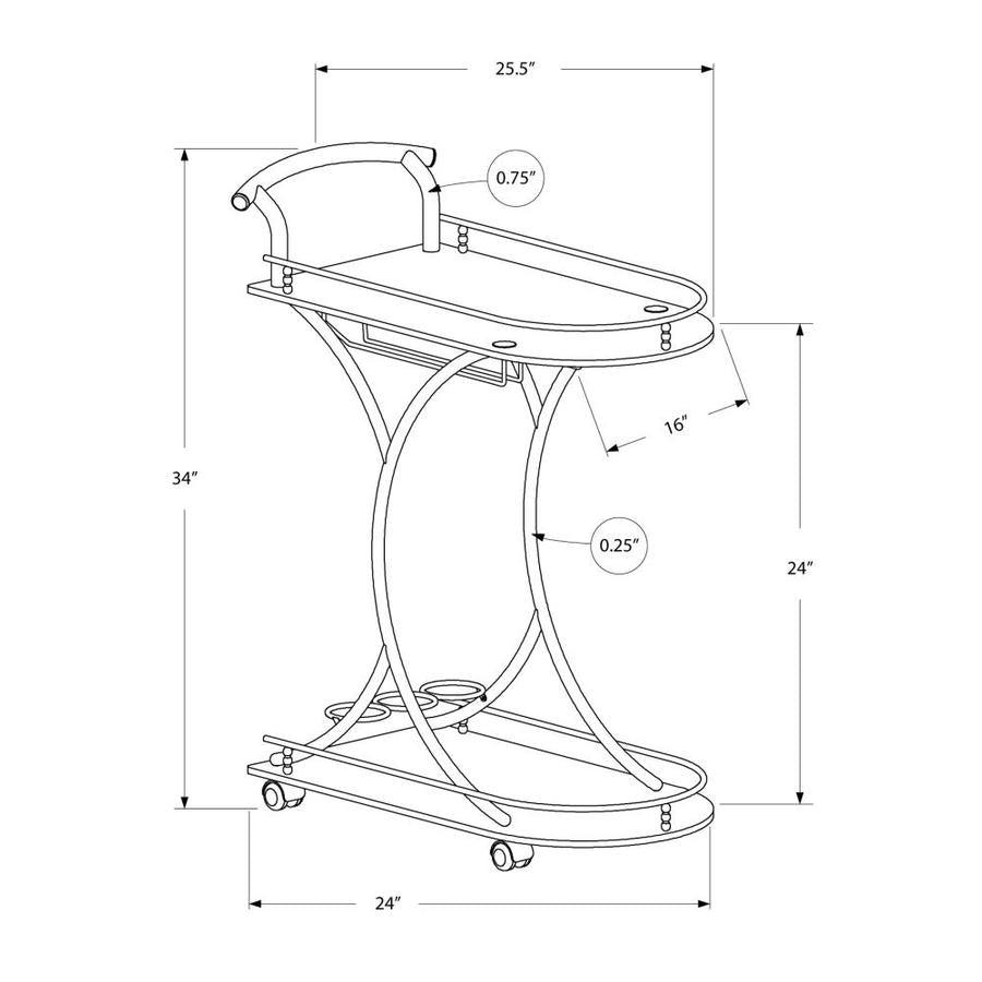 Modern design with frosted tempered glass shelves Blends well into any dining room or entertainment space Convenient glass holders to hang up to 4 wine glasses and 3 circular holders at the bottom for wine bottles (standard size) Spacious top and bottom shelves for serving and storing accessories Easy mobility with the cart on 4 rolling castors (2 locking and 2 unlocking) make it great for entertaining