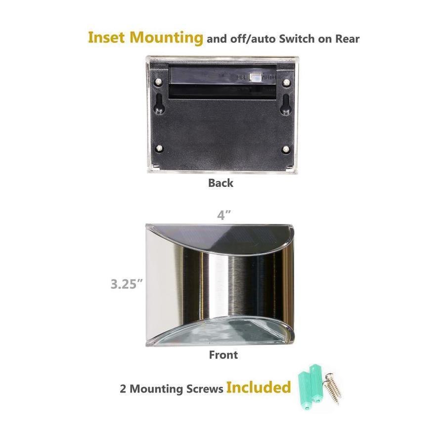 High performance solar lighting stays lit for up to 12 hours Lights up automatically every night and features auto-off switch 4 High output surface mount LED’s for a soft warm light Manufactured from durable stainless steel 1 Long life AA Ni-MH rechargeable battery included Quick and easy do it yourself installation 10 Lumens or 2700–3200 kelvin