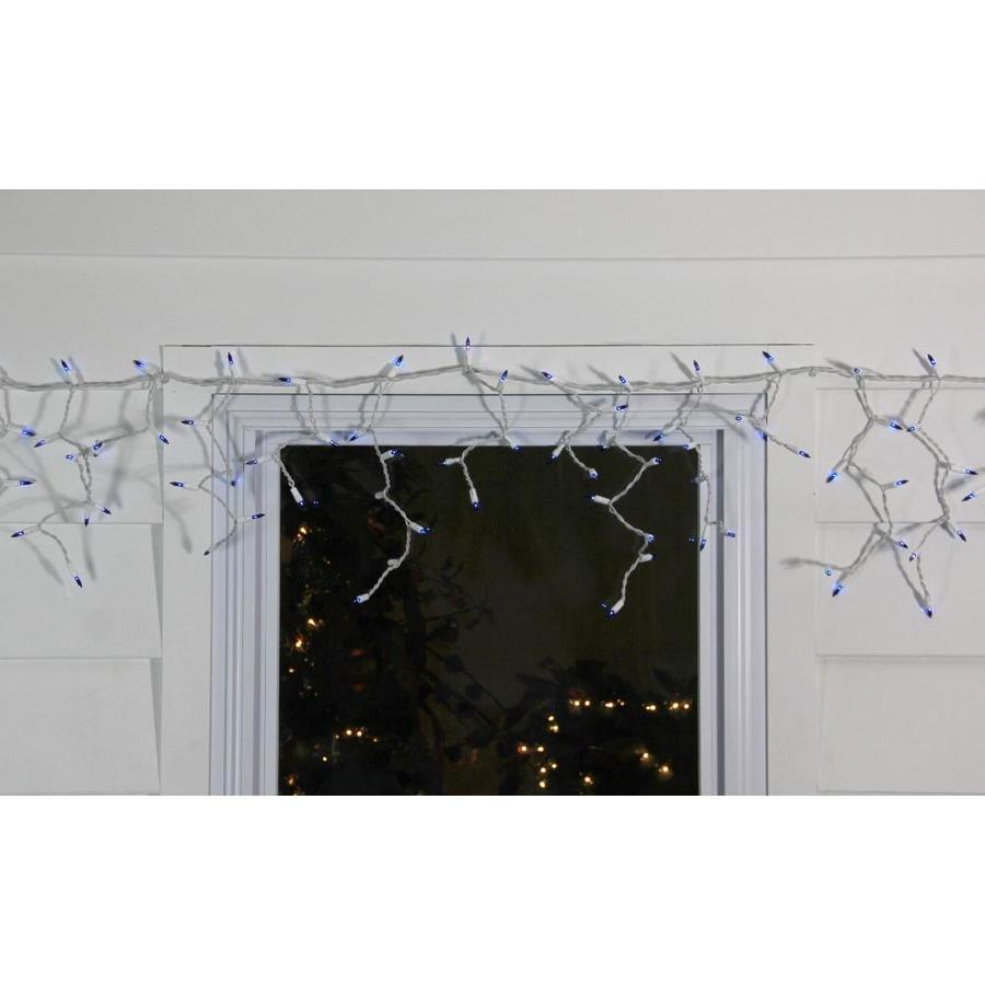 Set of 50 Christmas mini window curtain icicle lights Pre-lit with bright blue mini bulbs Spacing between each bulb 3 inches; Spacing between each drop is 6.25 inches UL listed for indoor and outdoor use Lighted length is 31.2 inches